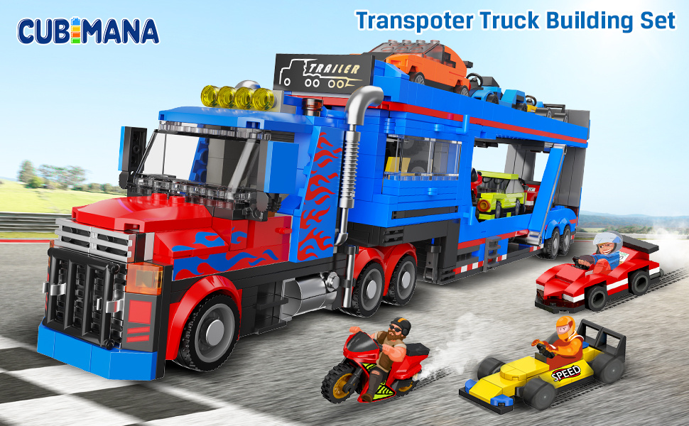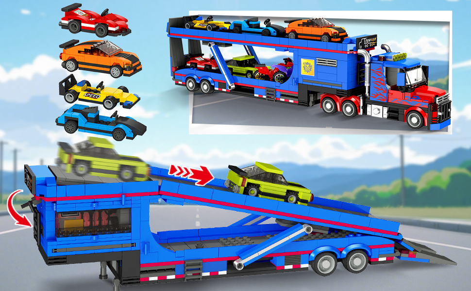 1050pcs Large Building Truck Set with 7 Sports Cars & Motorcycles - Adjustable Ramp, Removable Roof/Cab, Detachable Trailer - STEM for &, Realistic Tow Truck Play, Compatible with City Play