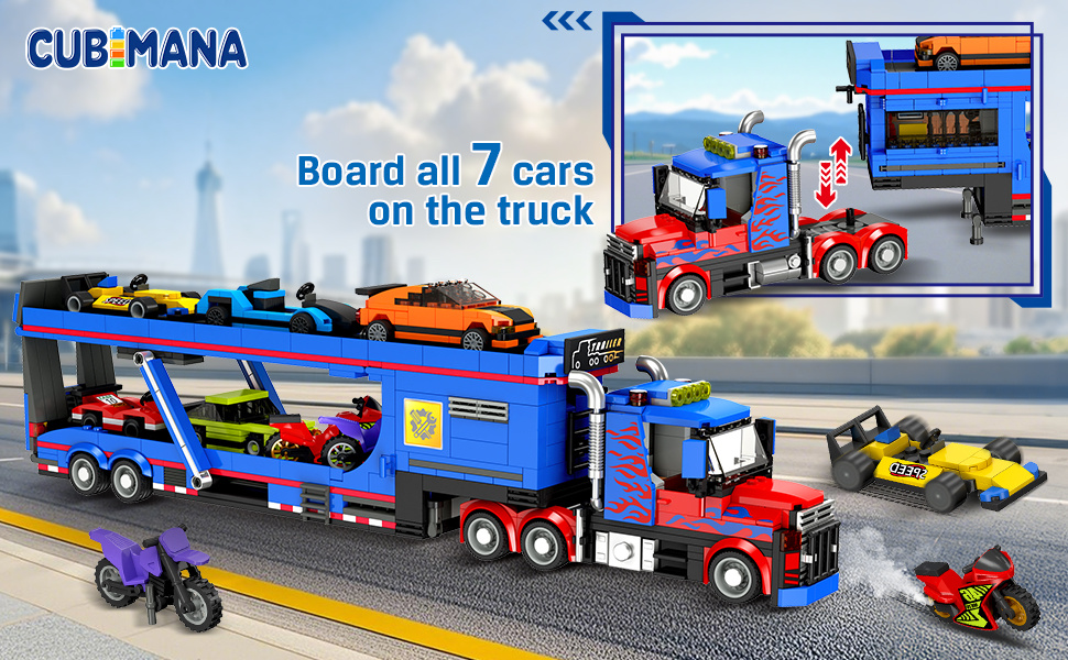This cool city transporter model includes a truck with a removable roof, 5 racing cars and 2 motorcycles, with a repair workshop, a liftable loading ramp, an openable cab, a removable slide and a detachable racing simulator room.