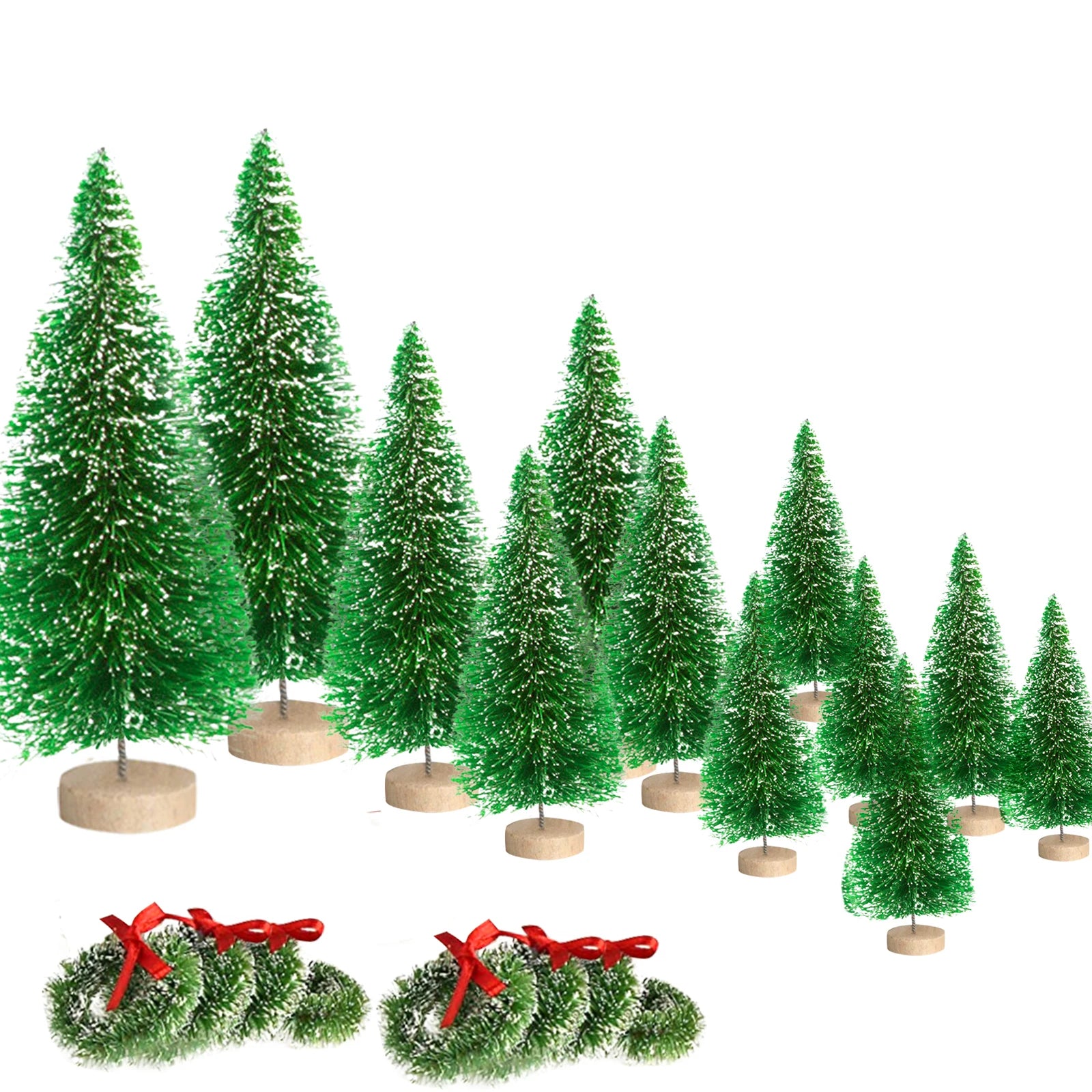 12PCS Artificial Mini Christmas Trees with 8PCS Small Christmas Wreaths, Bottle Brush Trees with Wood Base, Artificial Frosted