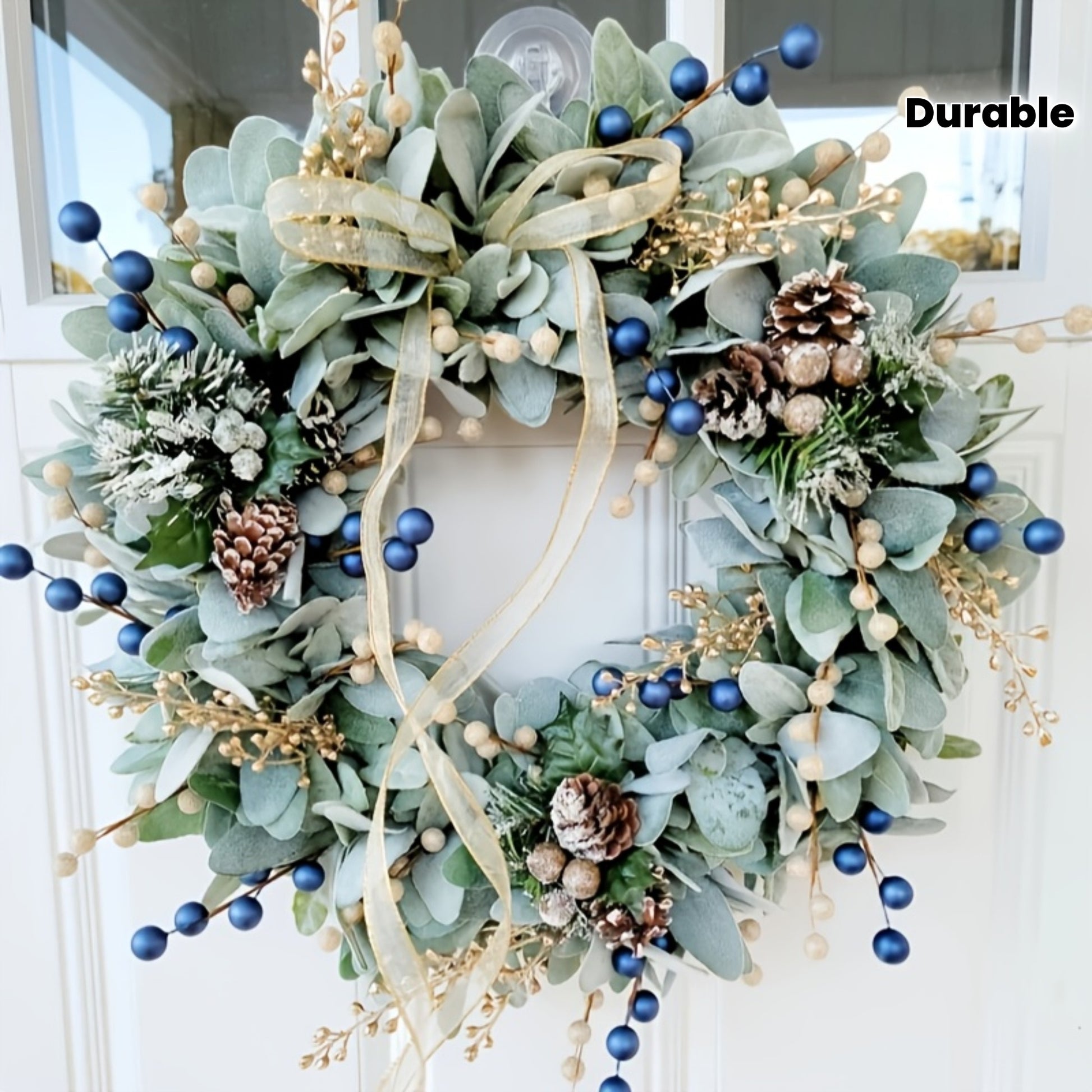 16-Inch Blue Eucalyptus Wreath with Golden Sheep Ears & Pine Cones - Elegant Front Door Decoration, Durable Plastic Faux Foliage for Year-Round Use, Christmas, Halloween, Housewarming Gift - Easy to Hang, No Maintenance Requi