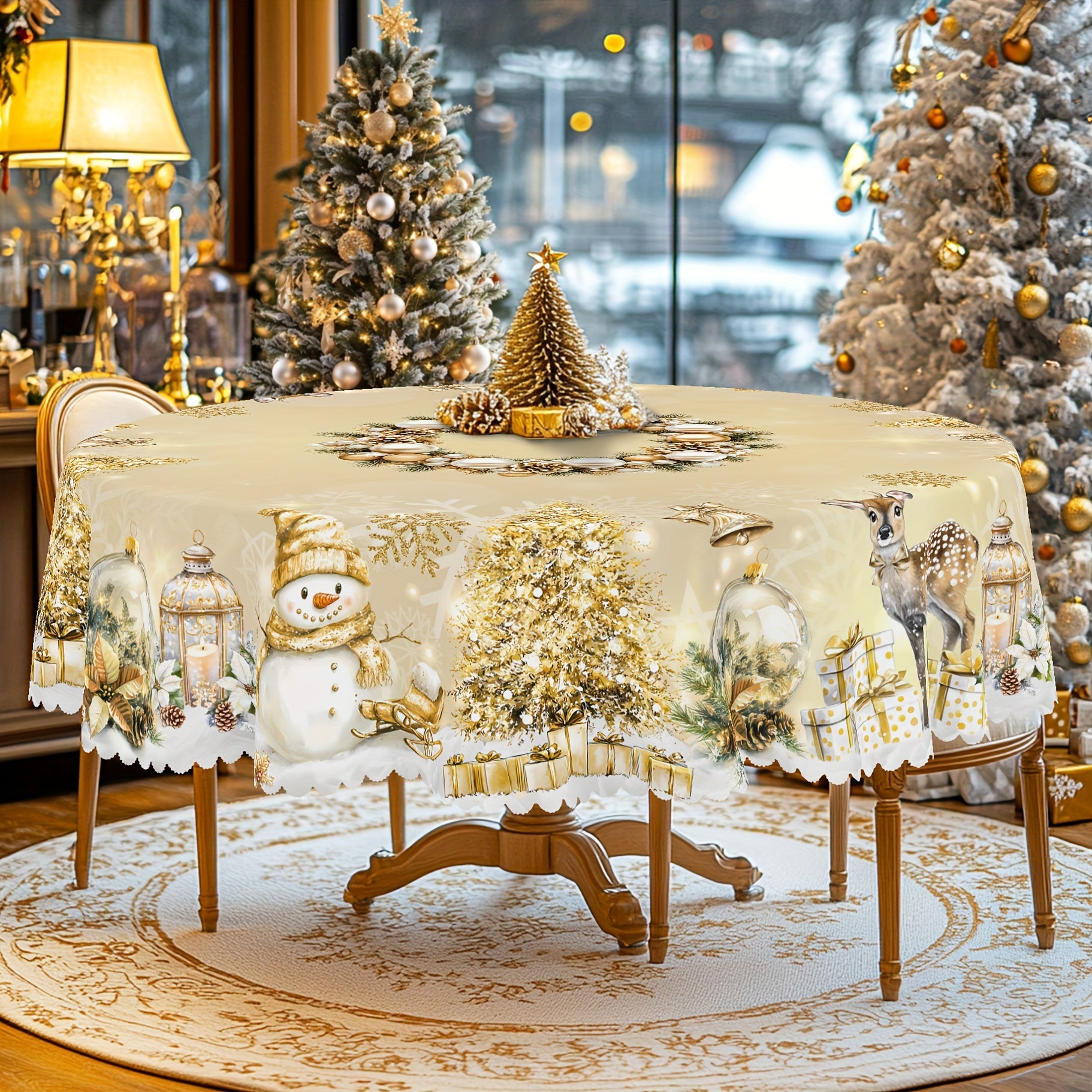 1pc Golden Christmas Happy Theme Printed Tablecloth, Retro Farmhouse Style, Snowman, Elk, Christmas Tree Pattern Design, Christmas, New Year Party, Party Decoration, Kitchen Accessories, Room and Outdoor Decoration, Gift for