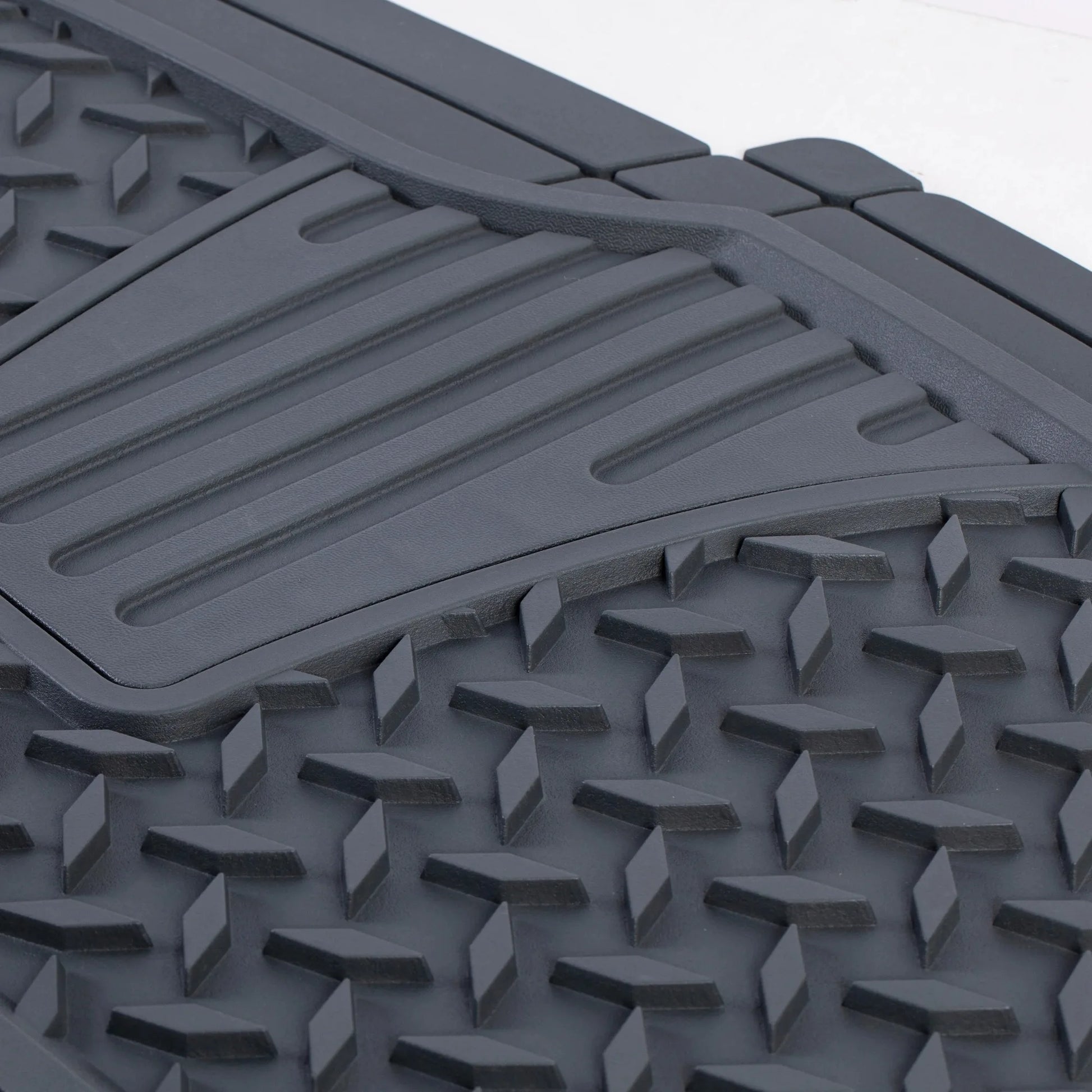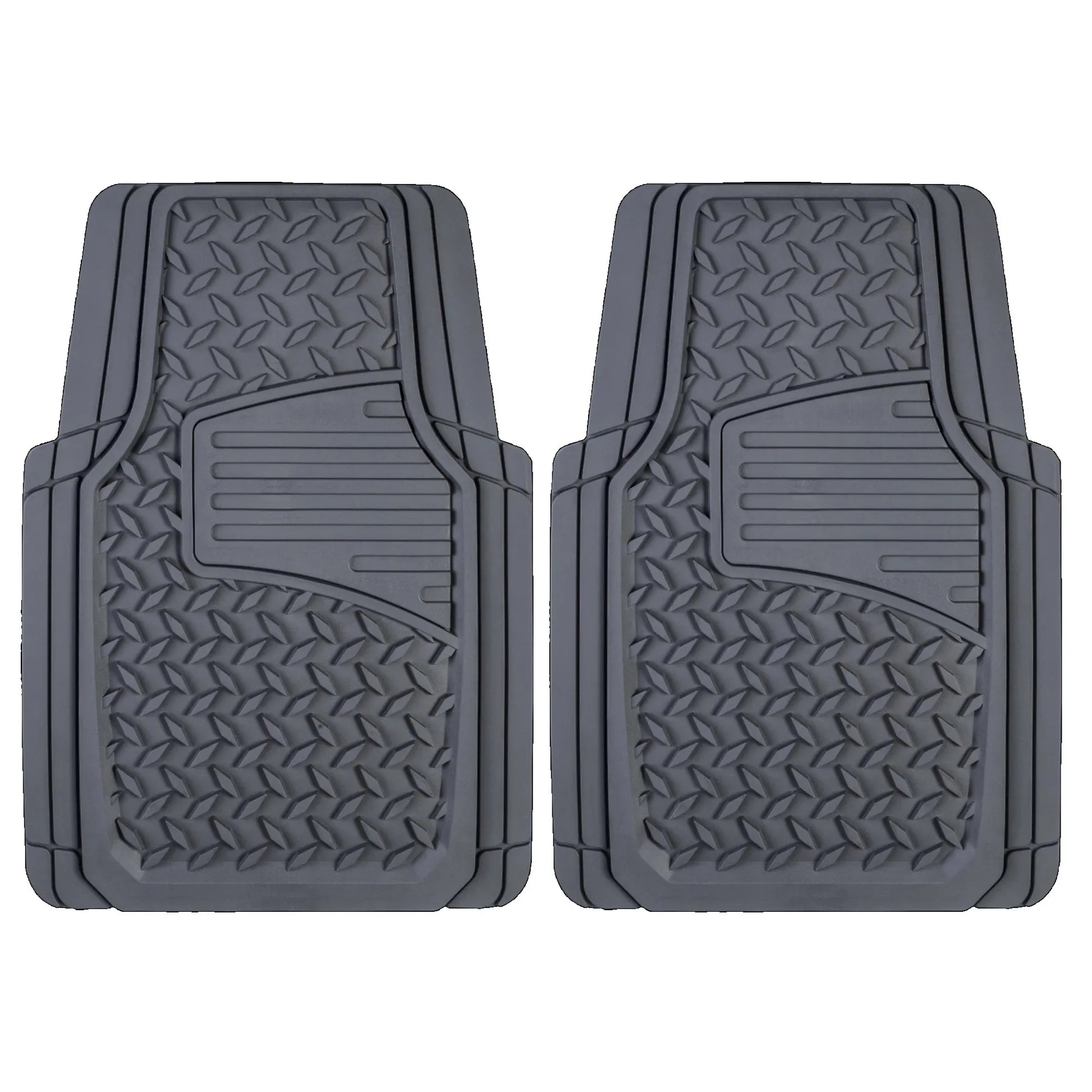 2PC Rubber Floor Mats Diamond Plate Grey Universal Fit For Most Cars, Trucks, SUVs and Vans; Made from pvc, this floor mat can protect your car floor well for a long period time and for all-weather all-season protection; Rubberized Nibs on the Bottom so the mat does not move; Protect your vehicle's flooring by catching spills, stains, dirt and debris