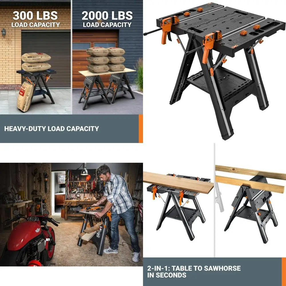 This product is a versatile Pegasus workbench and sawhorse designed for various tasks around the garage or wherever extra support is needed. It features an easy setup and fold-down mechanism for compact storage and comfortable carrying. The two-in-one design allows you to switch between a workbench and a sawhorse, making it suitable for projects of all sizes. The Pegasus offers a high load-bearing capacity of up to 300 lbs as a workbench and an impressive 1000 lbs as a sawhorse, capable of handling bulky lumber, potted plants, bikes, and heavy equipment. The workbench is easily expandable by adding another Worx support table, such as the Pegasus, Sidekick, or Clamping Sawhorse, all of which share the same height and connectors for seamless attachment. It boasts a large surface area of 31" × 25" and a working height of 32", providing ample space for staining, woodworking, painting, and repairs. Made from durable molded ABS plastic with steel supports and fittings, this workbench is built to last and weighs only 30 lbs, making it easy to transport. The Pegasus also includes an integrated clamping system with two 24" quick clamps that provide up to 301 lbs of clamping force, and four clamp dogs to hold circular or oddly shaped pieces in place. Additionally, it comes with a built-in measuring guide, eliminating the need to search for rulers or measuring tape. The package includes one Pegasus Worktable and Sawhorse, two 24" Quick Clamps, four Clamp Dogs, and two Table Links.