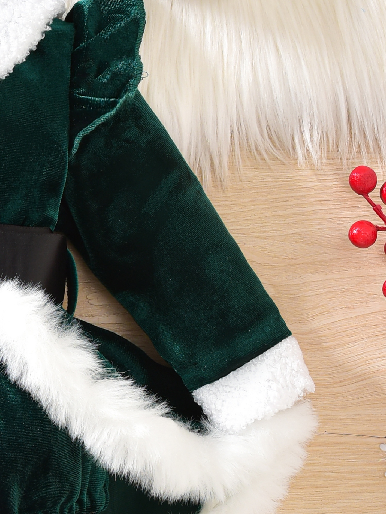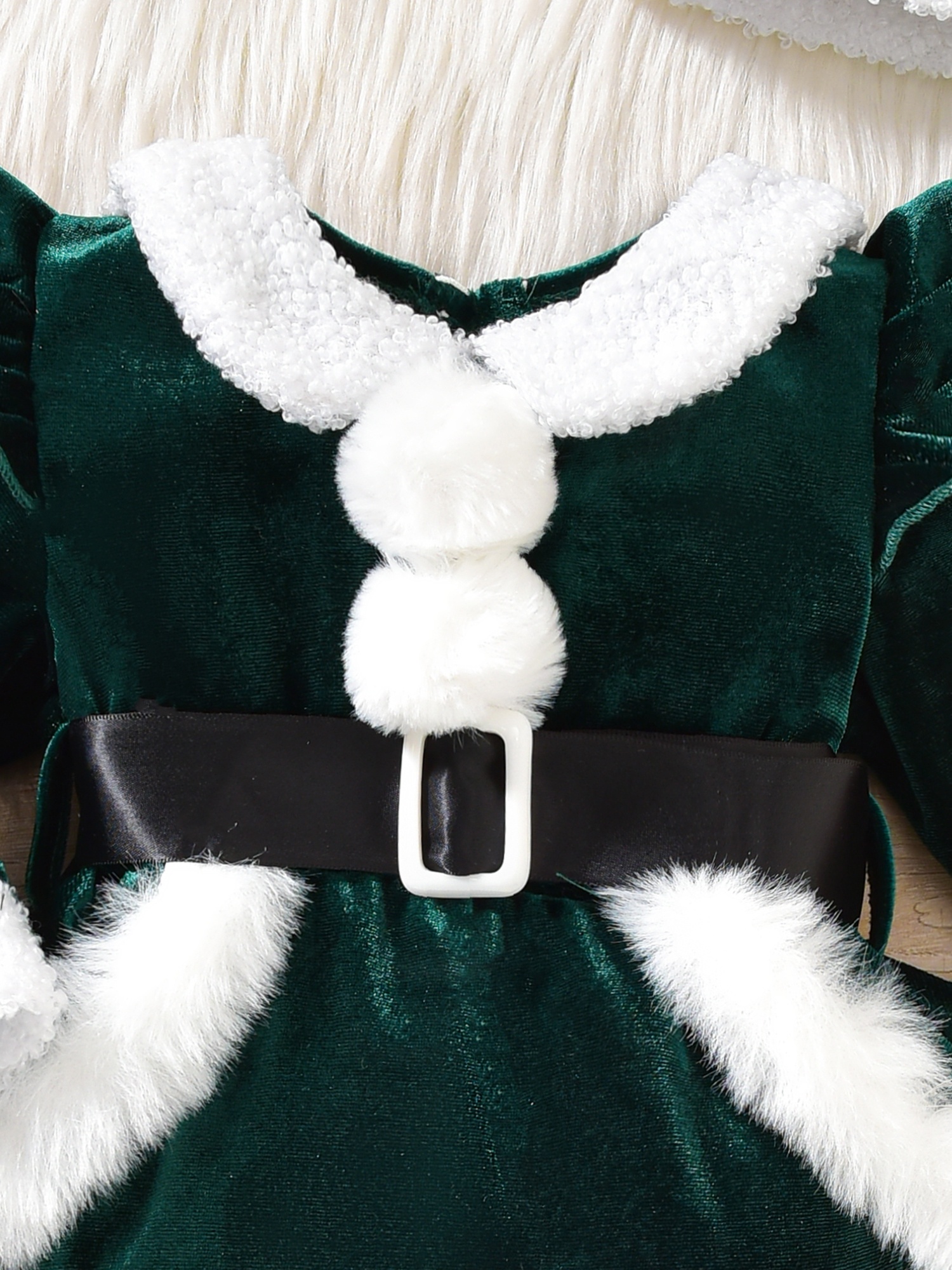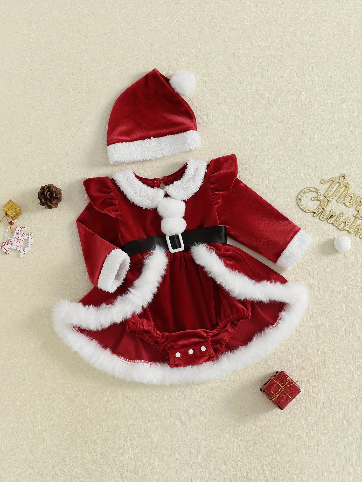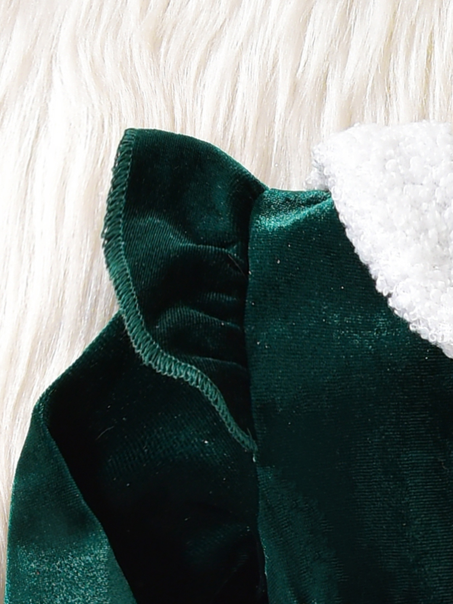 2pcs Set Baby Girls' Plush Patchwork Christmas Romper Dress & Hat Set - Soft Green & White Long Sleeve Jumpsuit with Ruffled Trim, Snap Closure, Cozy Winter Outfit for &, Machine Washable Holiday Outwear (Christmas Party Outf
