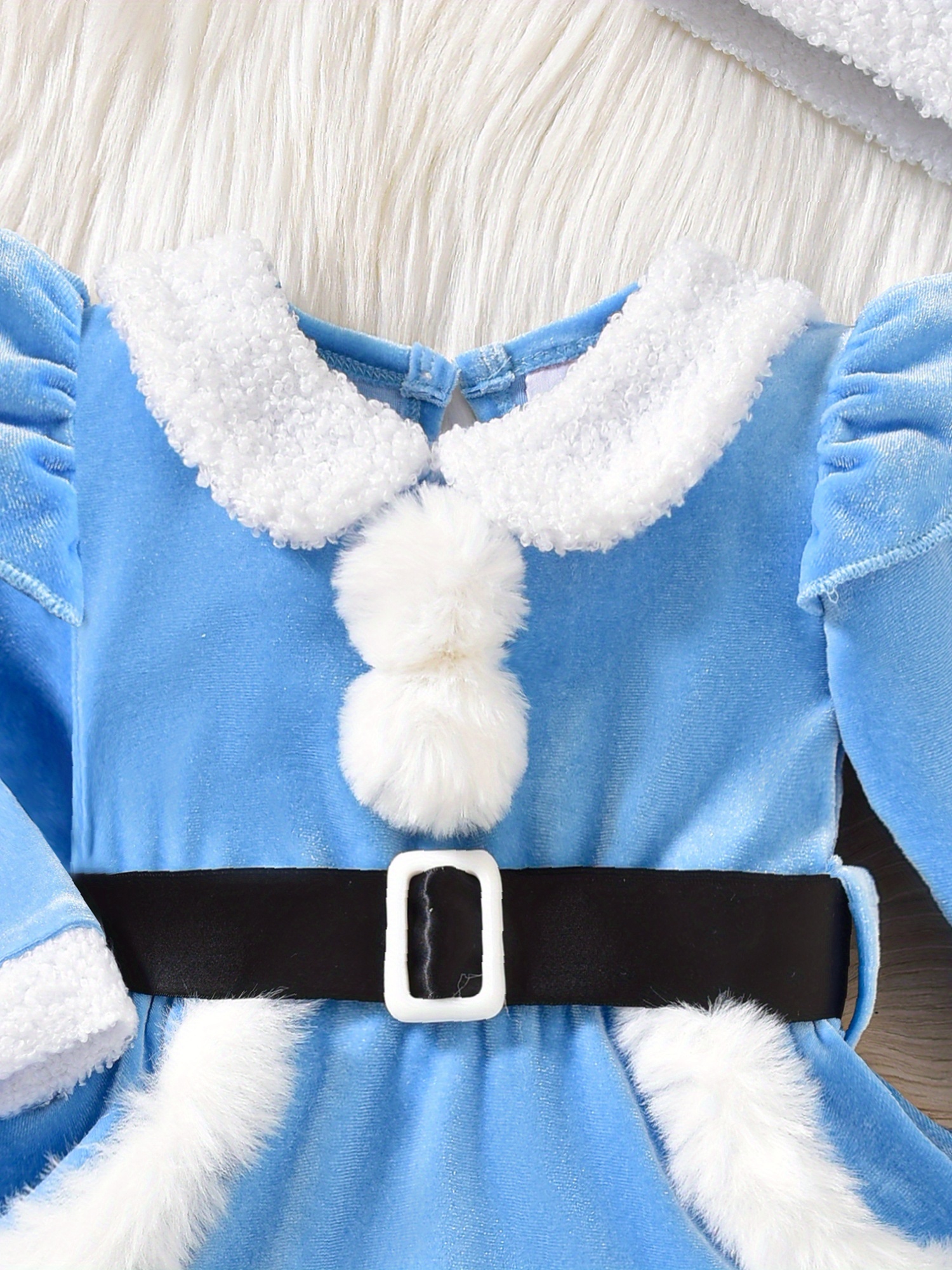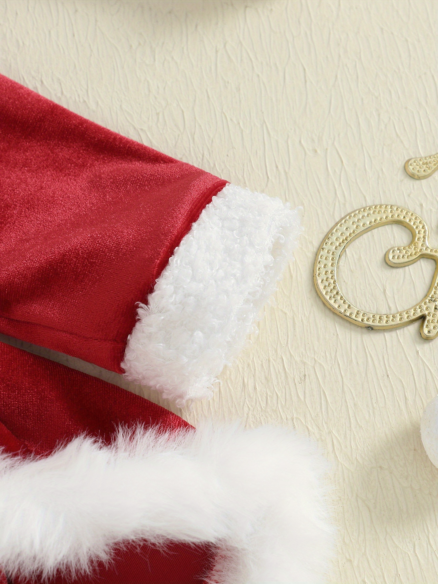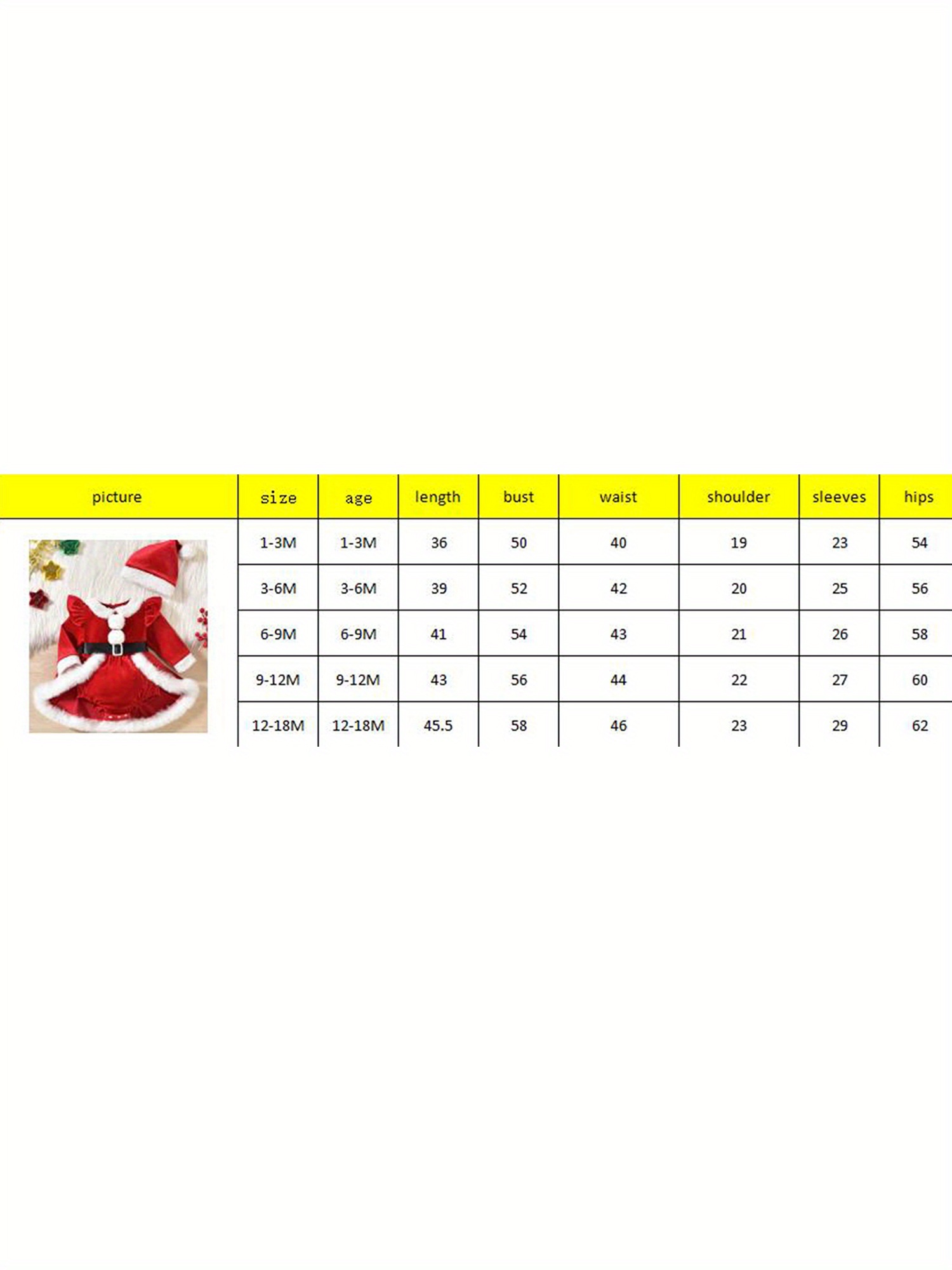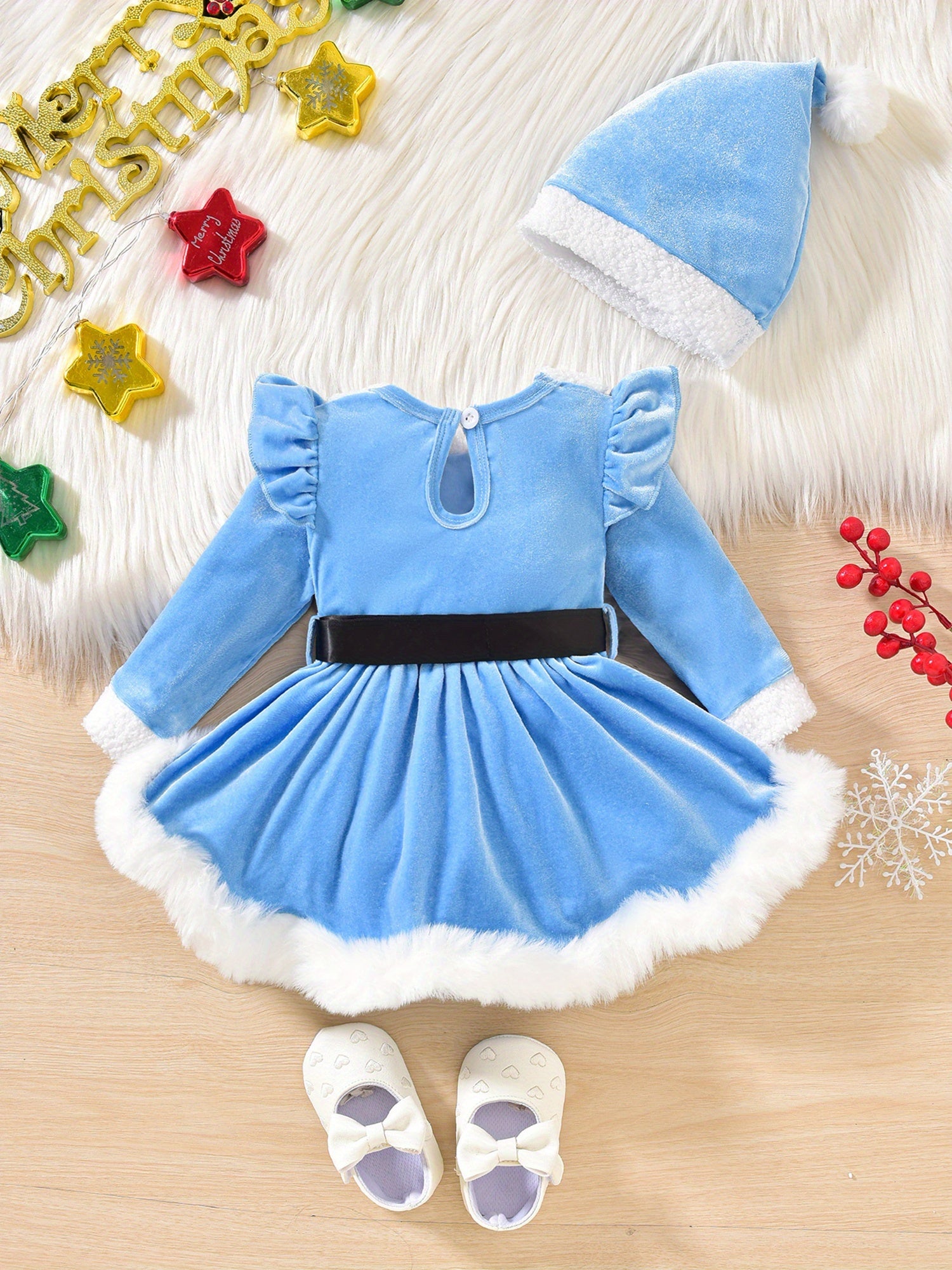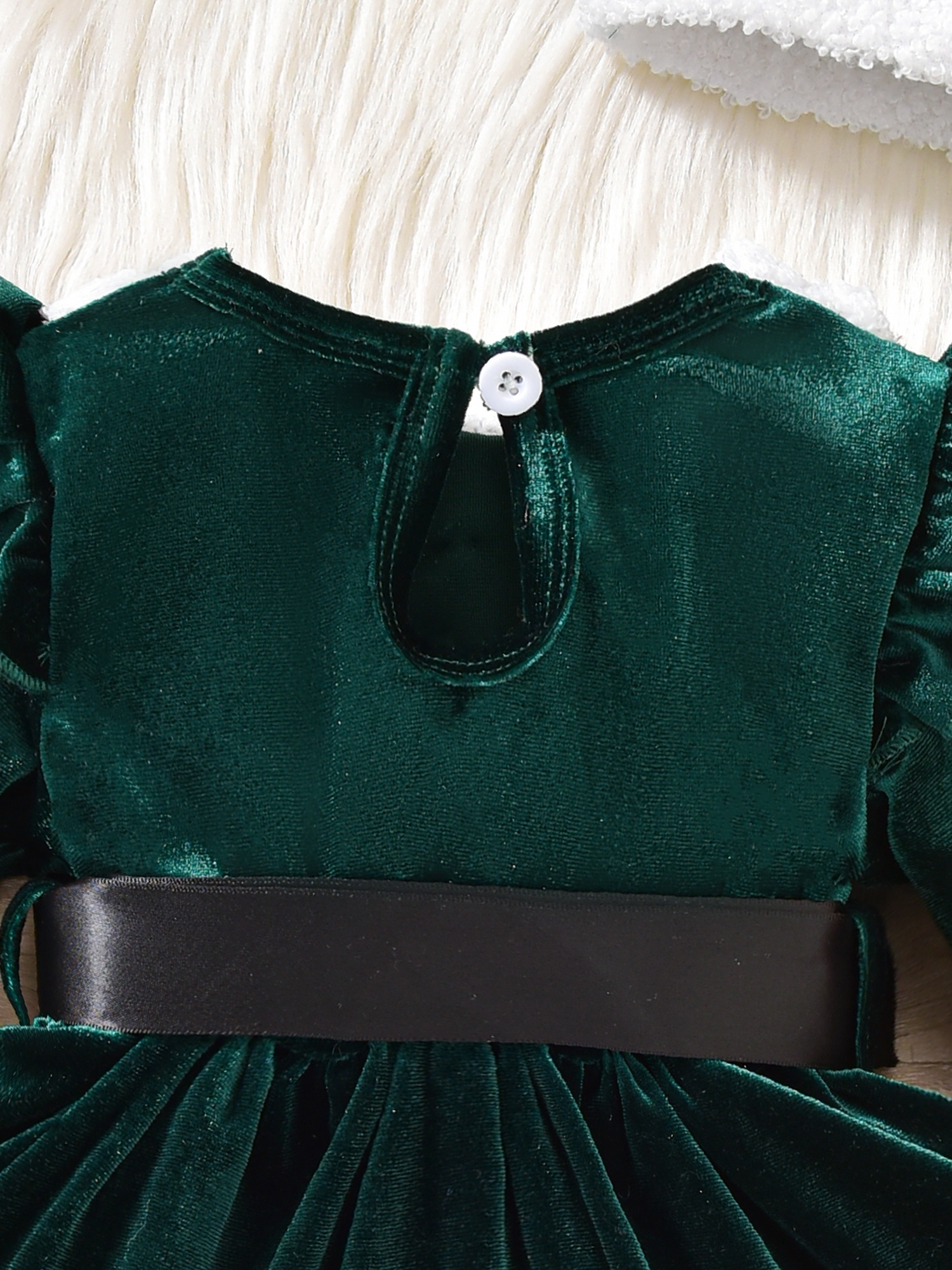 2pcs Set Baby Girls' Plush Patchwork Christmas Romper Dress & Hat Set - Soft Green & White Long Sleeve Jumpsuit with Ruffled Trim, Snap Closure, Cozy Winter Outfit for &, Machine Washable Holiday Outwear (Christmas Party Outf