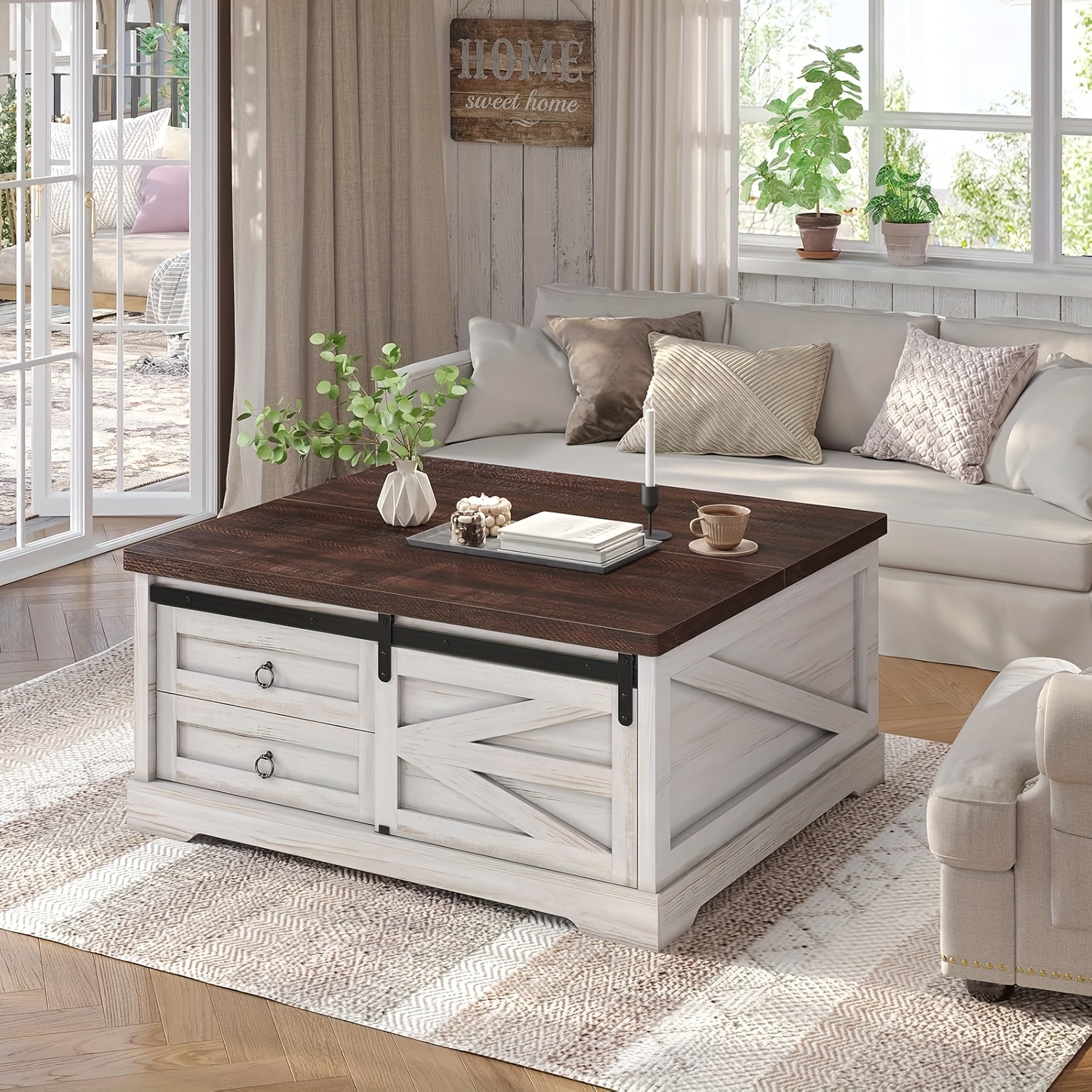 [Farmhouse Coffee Table]This lift top coffee table features a classic barn door design with black metal accents that add a touch of vintage charm. It is a perfect blend of modern country and retro farmhouse styles. The unique square design complements your sofa well and fits perfectly in both small and large spaces.