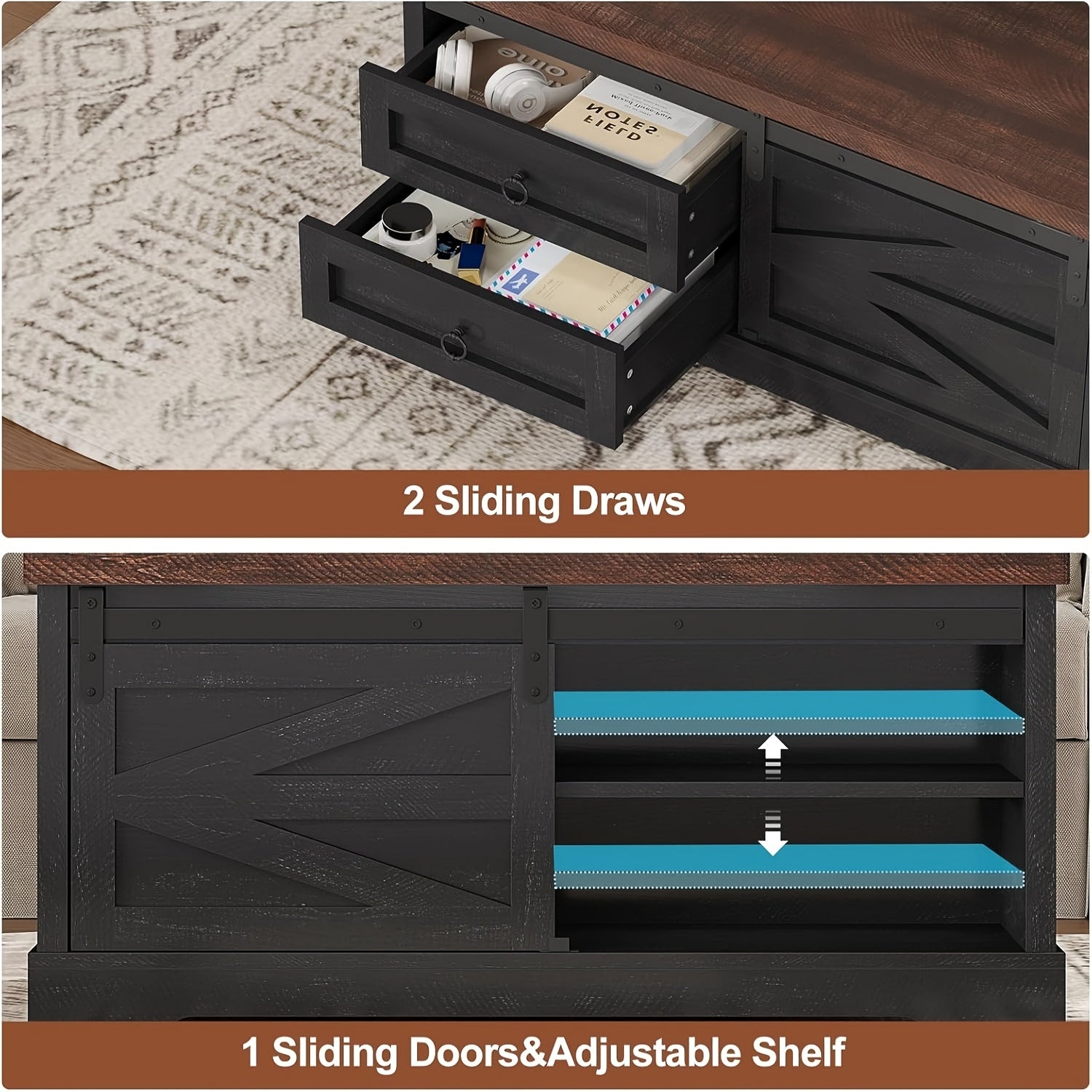 39.4" Lift Coffee Table with Storage, Sliding Barn Door and Adjustable Shelf, Farmhouse Square Center Table with Large Hidden Compartment and 2 Drawers, Suitable for Living Room, Black