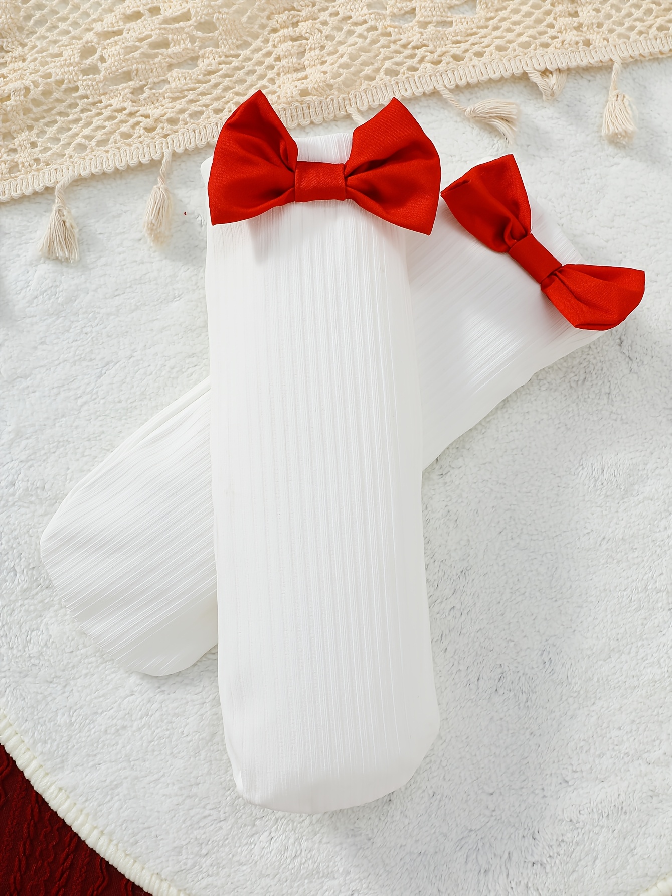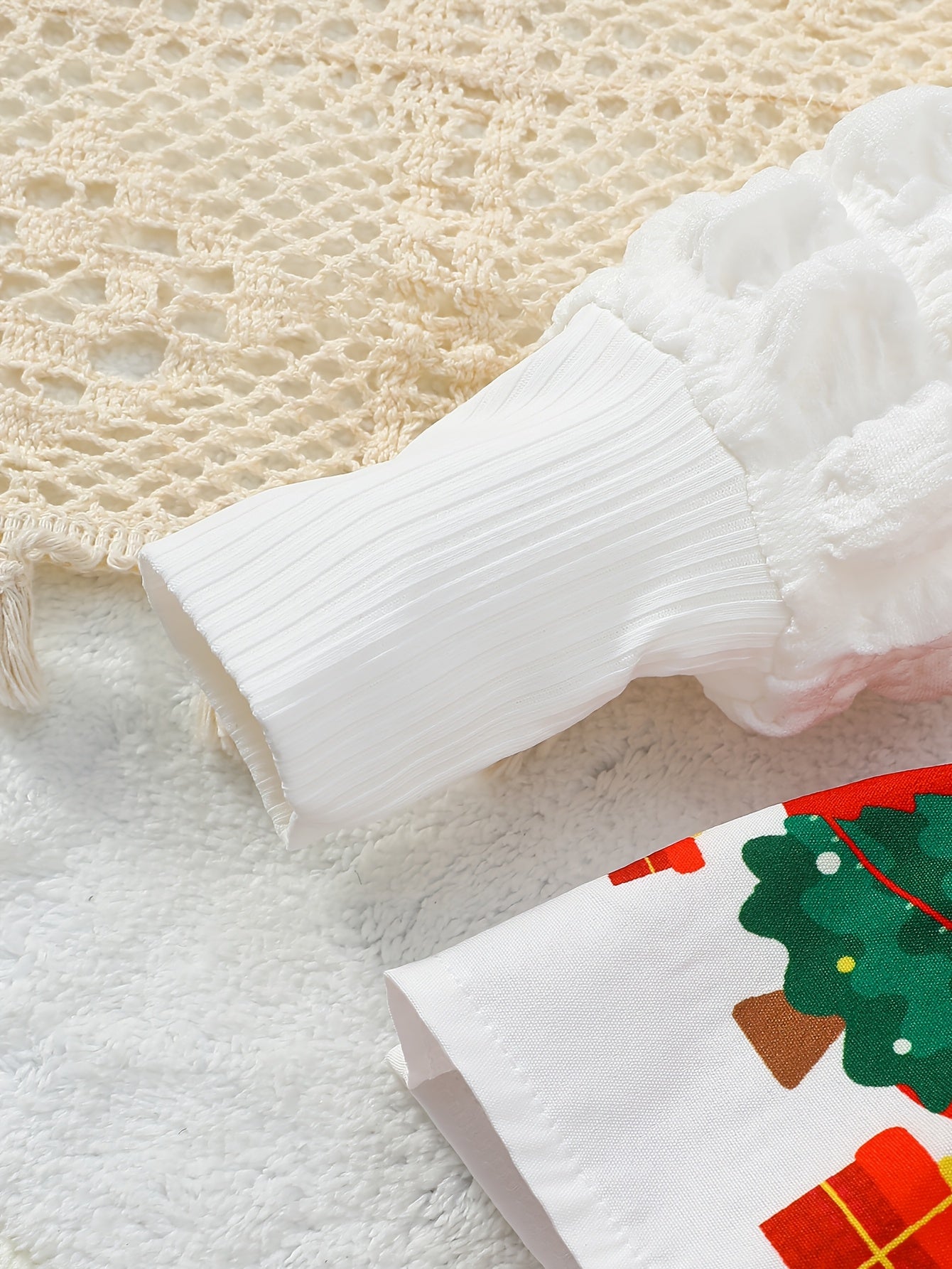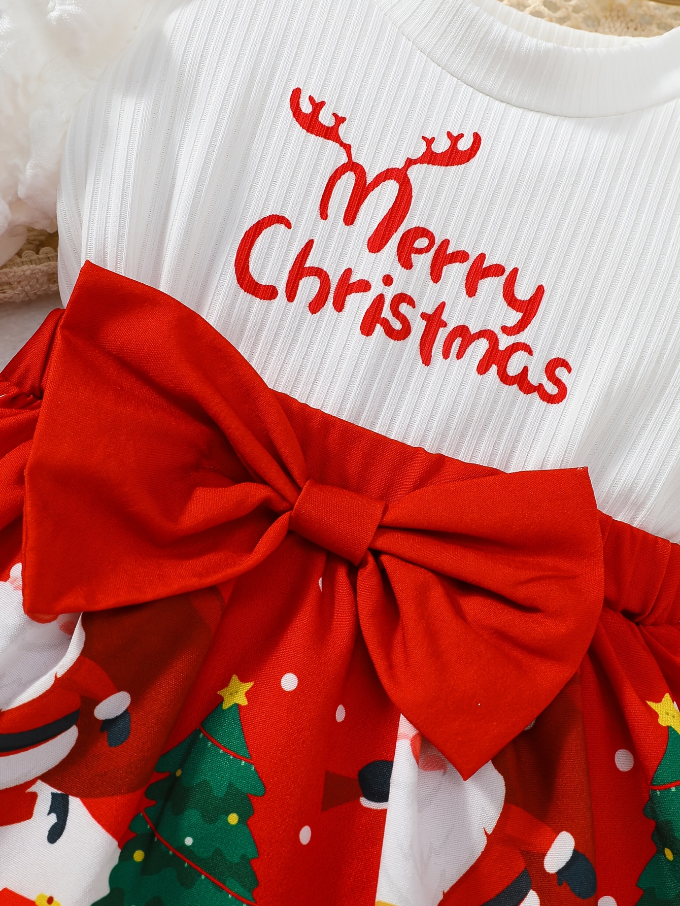 3pcs Set for Baby Girls Featuring a Christmas-Themed Long-Sleeve Romper Dress with a Round Neck, Lantern Sleeves, And Santa Claus Print, Along with a Headscarf And Socks, for Outdoor