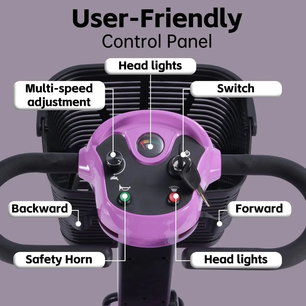 - Safe and Reliable Riding: The 4-wheel mobility scooter is capable of handling various surfaces, both indoors and outdoors, ensuring you travel with comfort and peace of mind. This scooter has a maximum weight capacity of 265 lbs, with its body and tires engineered for durability and safety. It is equipped with easy-grip, solid, air-free tires