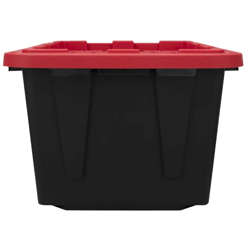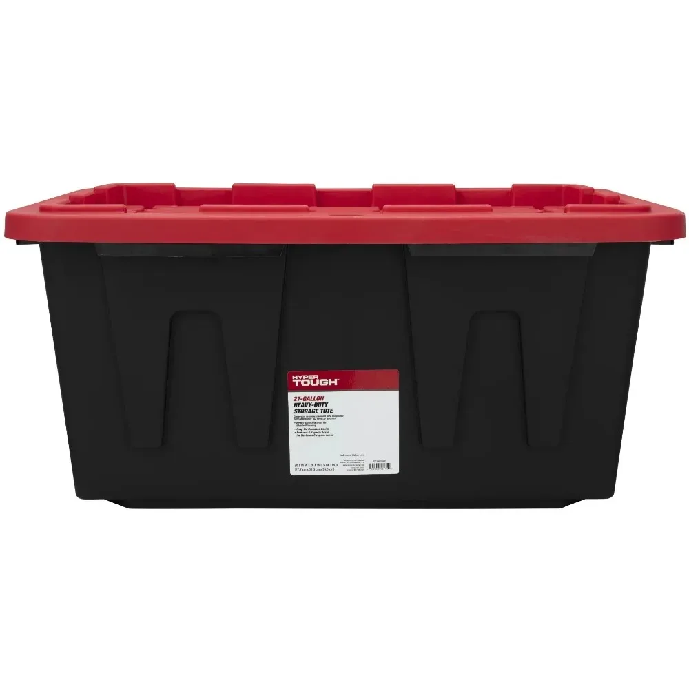 Organize clutter and hide unused items with the Hyper Tough 27 Gallon Snap-Lid Plastic Storage Tote Box with a black base and red lid. Made of durable plastic (polypropylene), the tough storage tote allows you to hide away things you don’t want to be seen while the red snap-lid adds a pop of color to your space and makes it easy to find. The 2-point snap-lid ensures your items are safely secure during storage or transport. The specially molded lids allow you to stack multiple totes on top to prevent toppling while maximize storage space. Protect your valuables by utilizing the 6 tie-down holes made for zip-ties and padlocks. The long lasting Hyper Tough tote works great in basements, closets, pantries, sheds, barns, and attics. This tote is great for organizing household products, gardening supplies, pet treats and supplies, shoes, clothing, seasonal gear like boots, sporting equipment such as golf balls, tennis balls, or drill cones, and many other items.