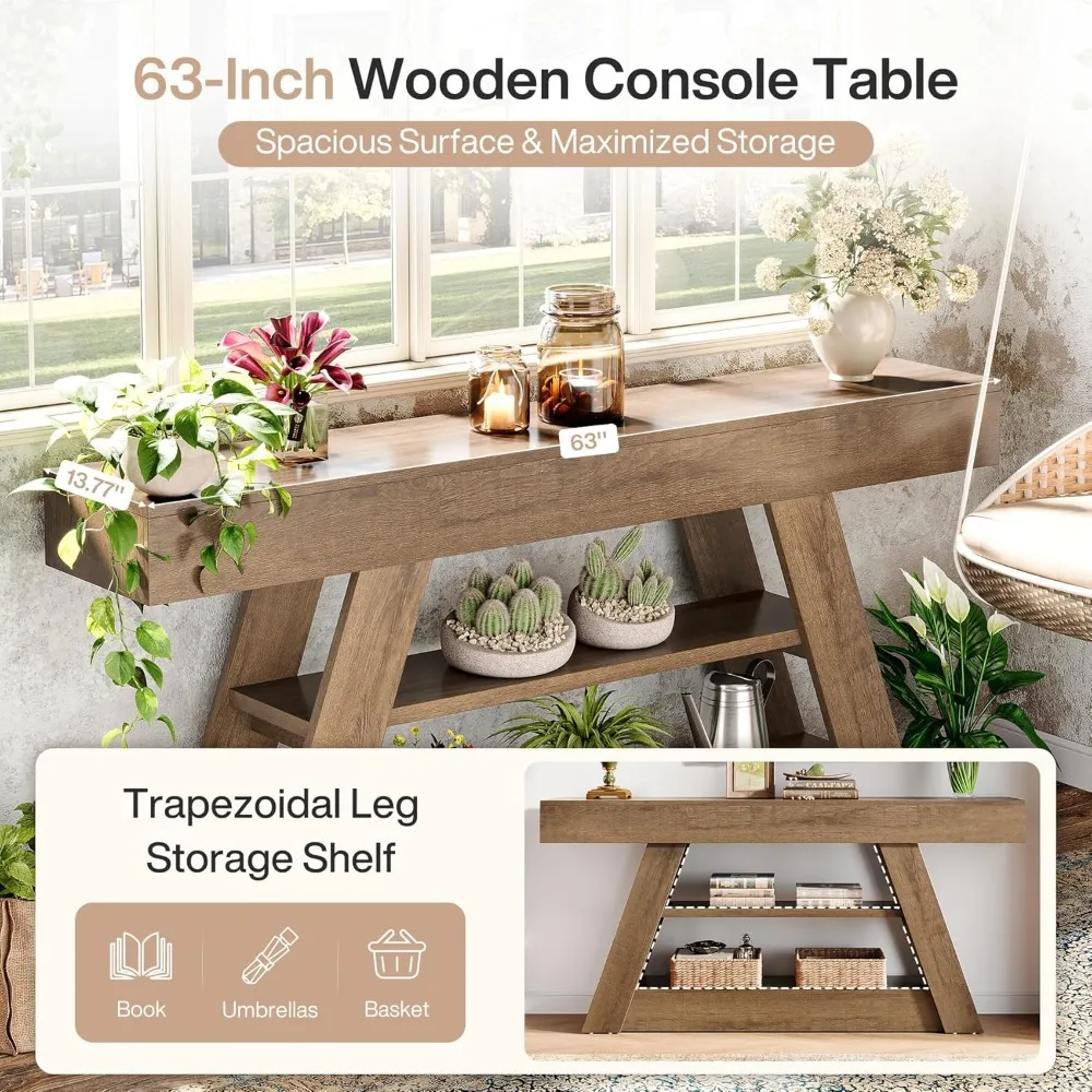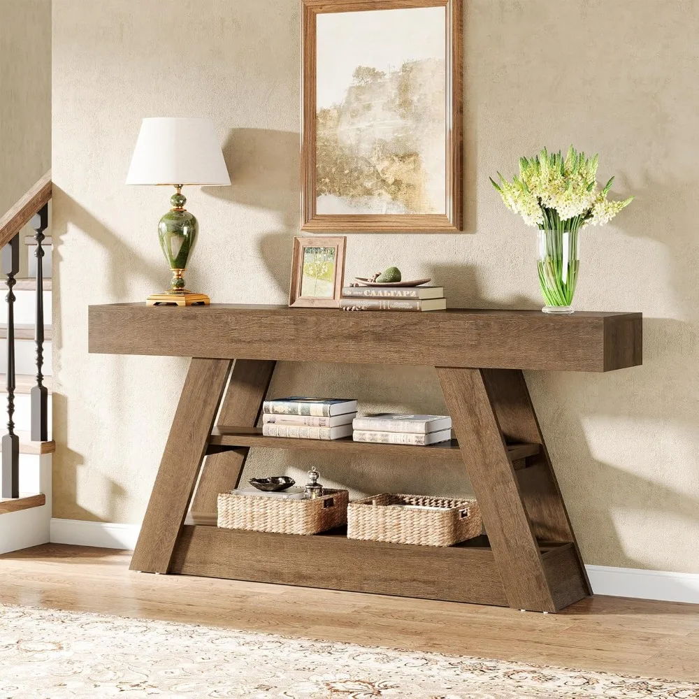 Rustic Console Table: This console table features a warm wooden finish and a sleek A-frame design, embodying the essence of farmhouse style. It effortlessly blends with rustic, modern, or coastal decor, adding a sophisticated touch to any room. Ample Storage & Display: Boasting a 13.77" wide by 63" long tabletop and two spacious open shelves, this wooden console table provides ample space for displaying decorative items like lamps, vases, or for storing essentials such as cups, books, and baskets. Premium Construction: Made from high-quality medium-density fiberboard with a smooth, scratch-resistant surface, this 63-inch console table is durable and long-lasting. The reinforced A-frame structure offers exceptional stability and reliable support. Perfect for Any Room: Ideal as an entryway table for keys or a wallet, a sofa table behind the couch for a cozy reading nook, or a decorative piece in a hallway, its versatile design suits various needs, enhancing both style and functionality.