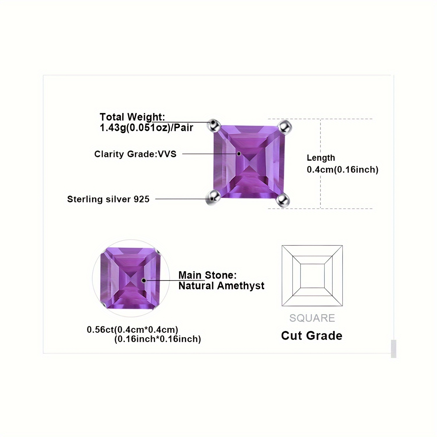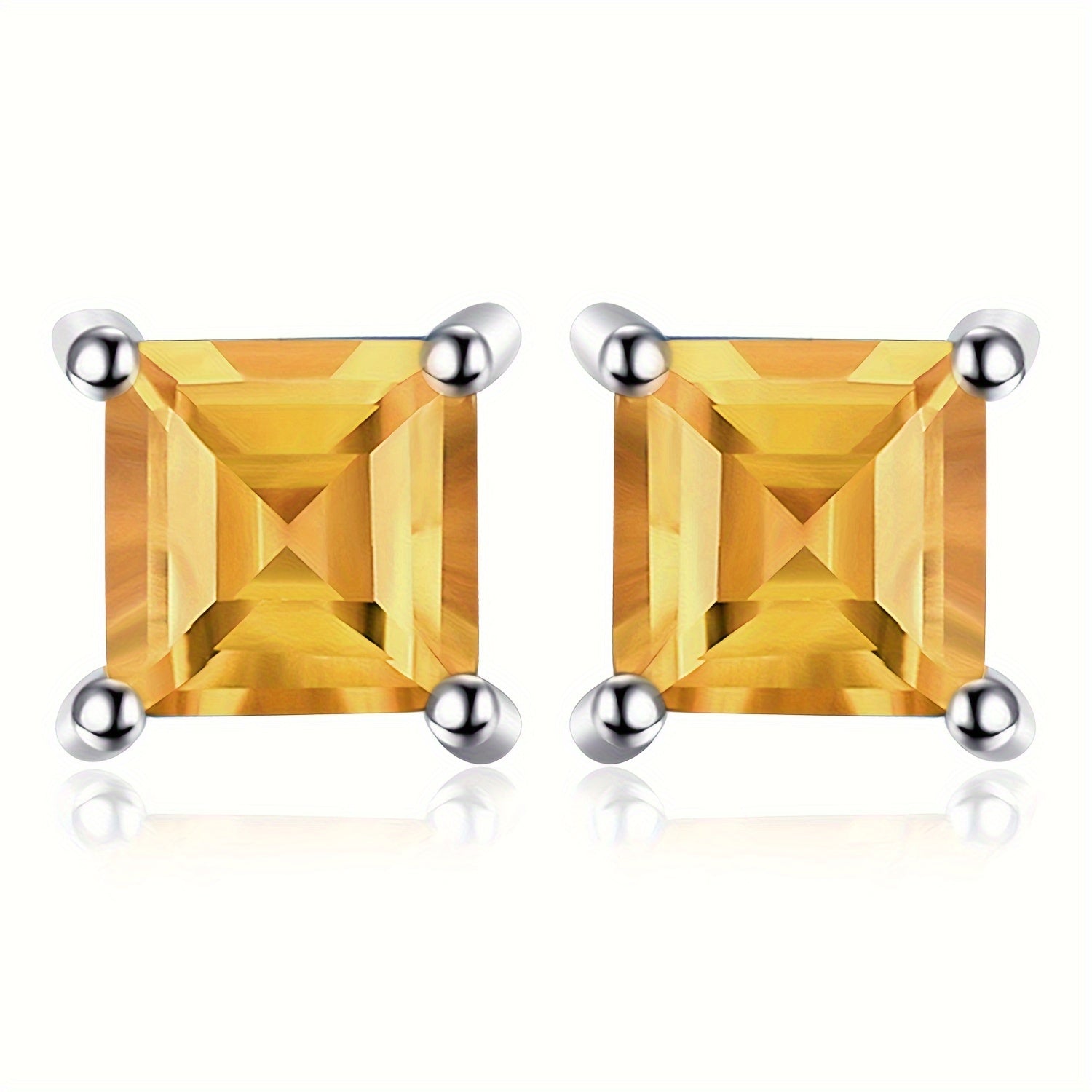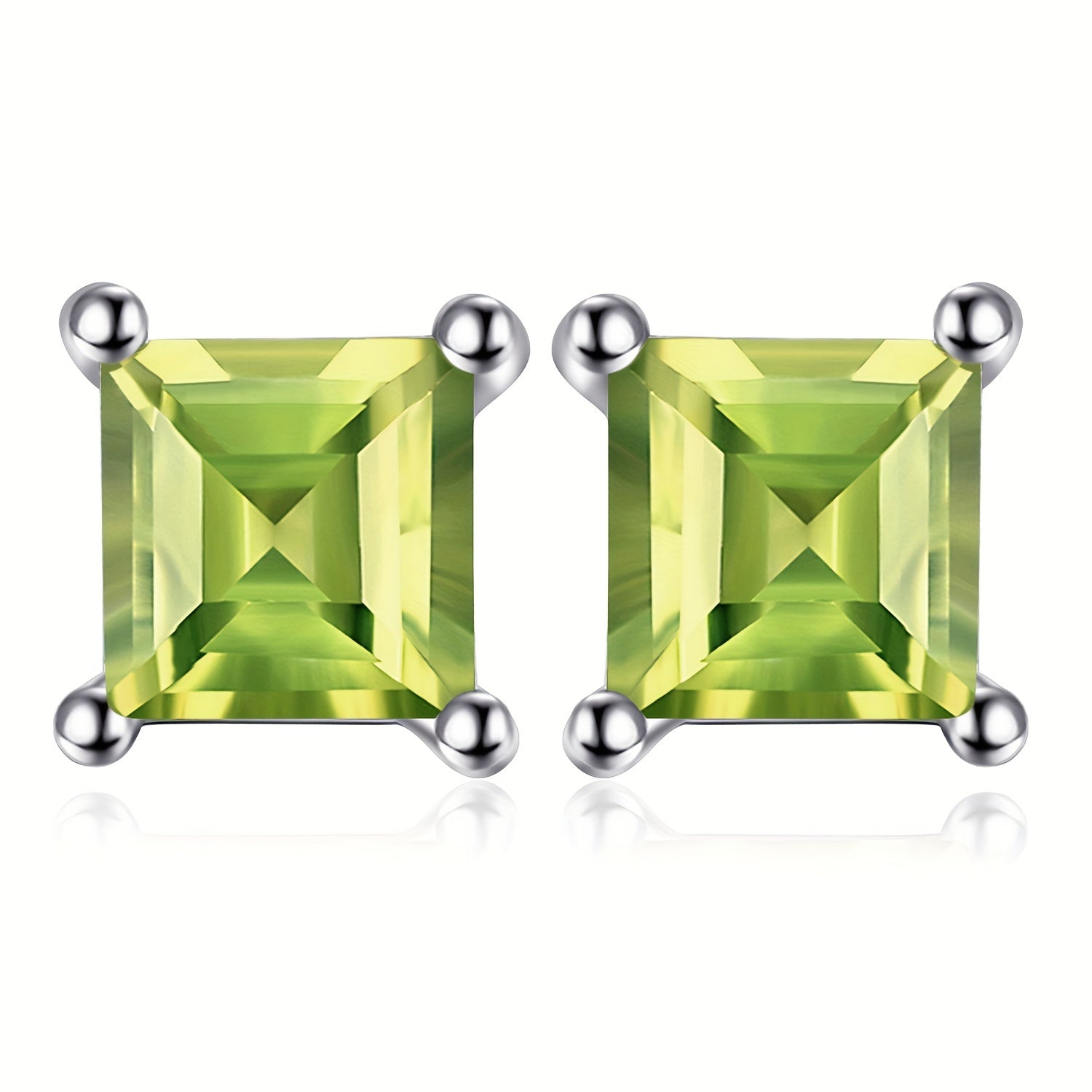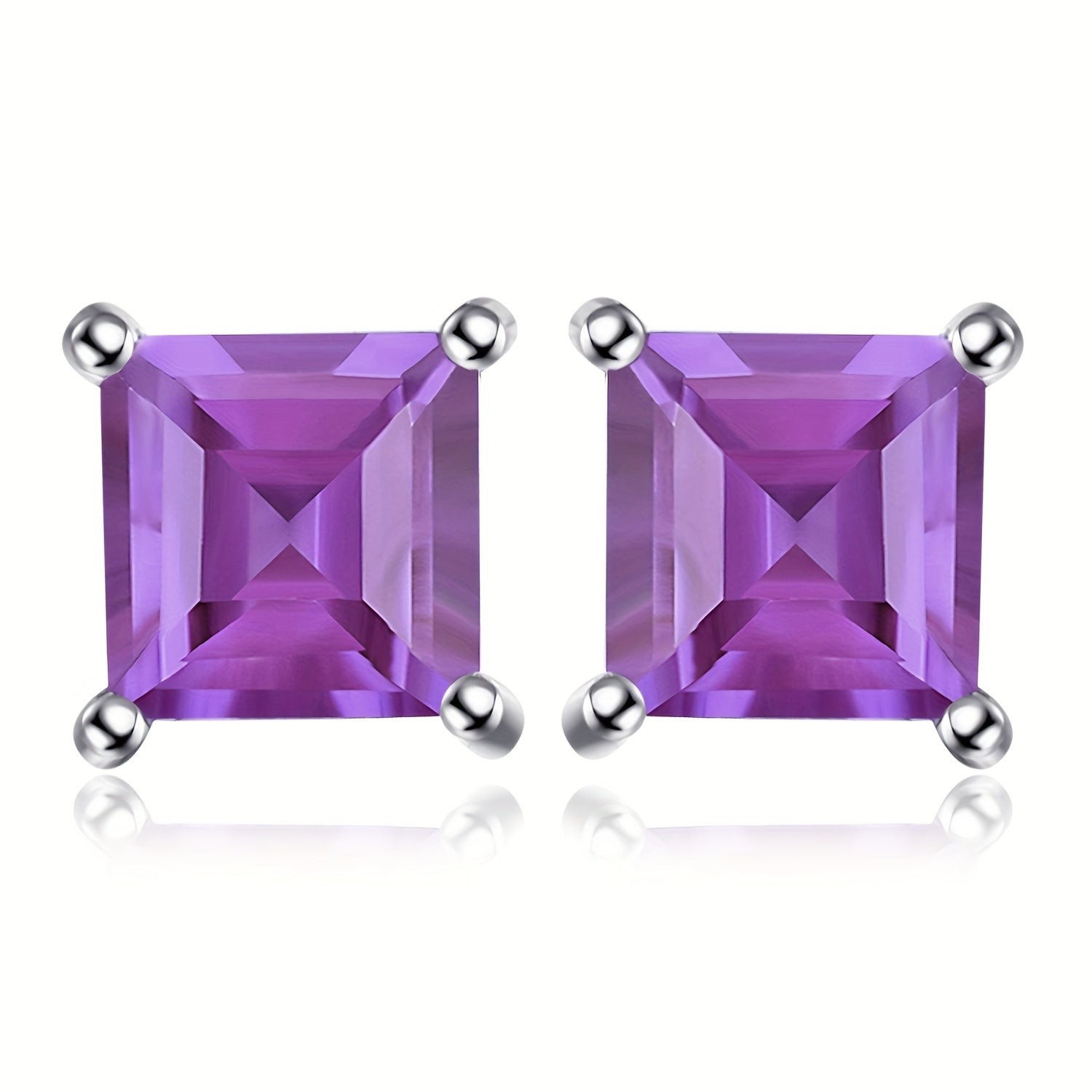 A Pair of 925 Sterling Silver Stud Earrings Featuring a Simple Yet Elegant Classic Design, Adorned with Exquisite Multi-Faceted Square Cut Natural Gemstones Including Amethyst, Citrine, Garnet, Peridot, Topaz, Created, Sapphi