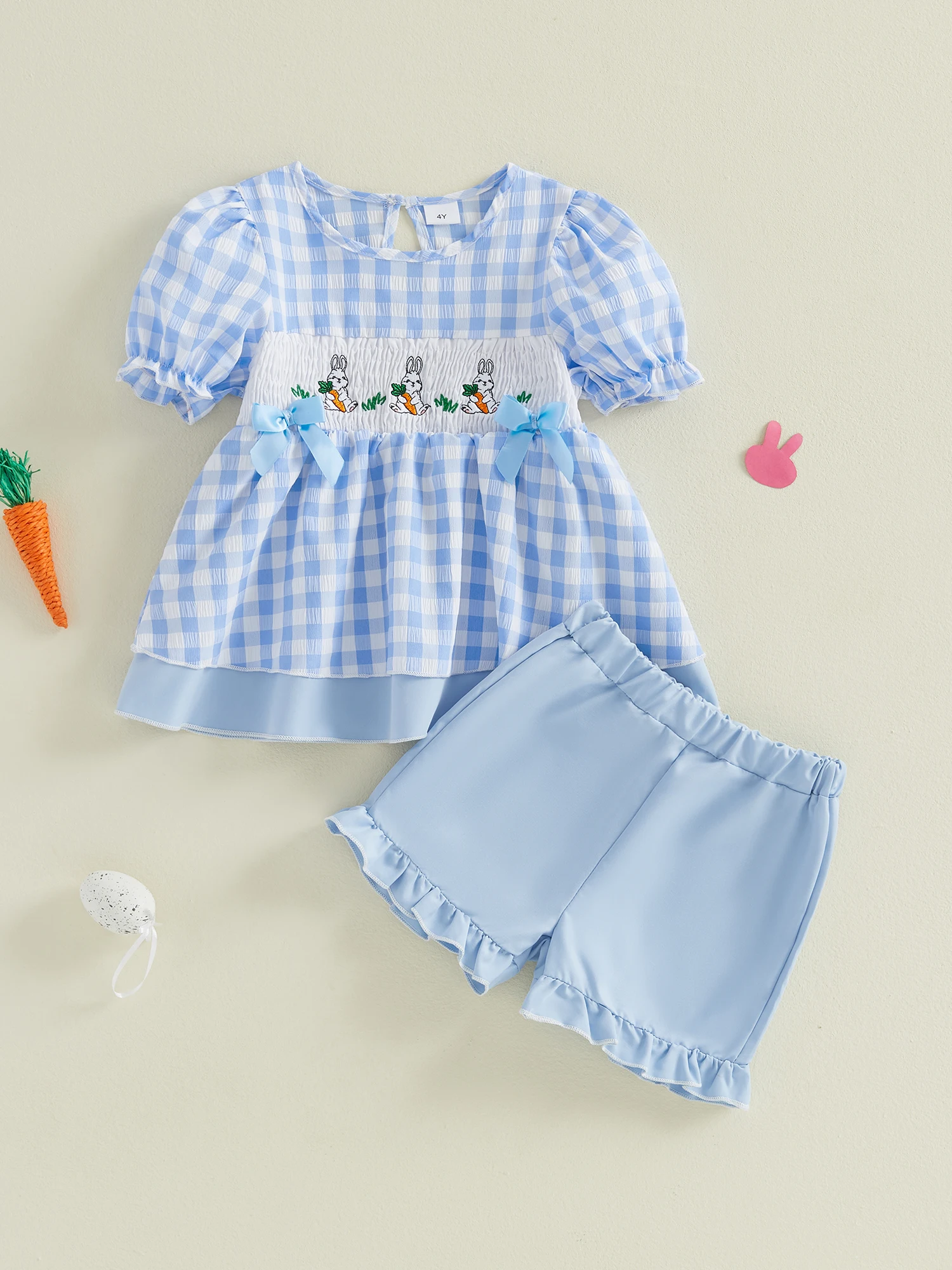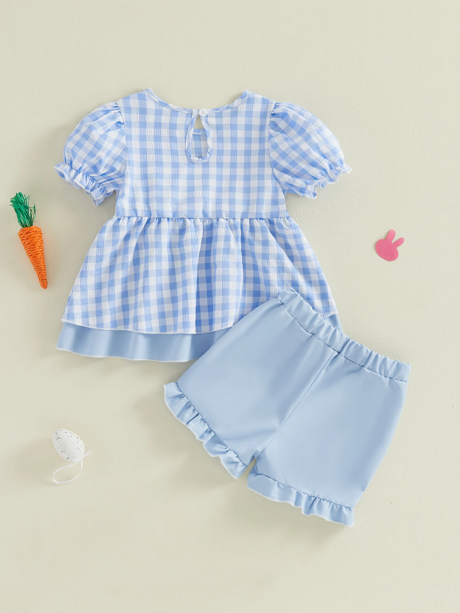 Adorable Girls Easter Outfit Set with Bunny Embroidery Plaid Shorts and Round Neck Top - Fashionable 2 Piece Ensemble