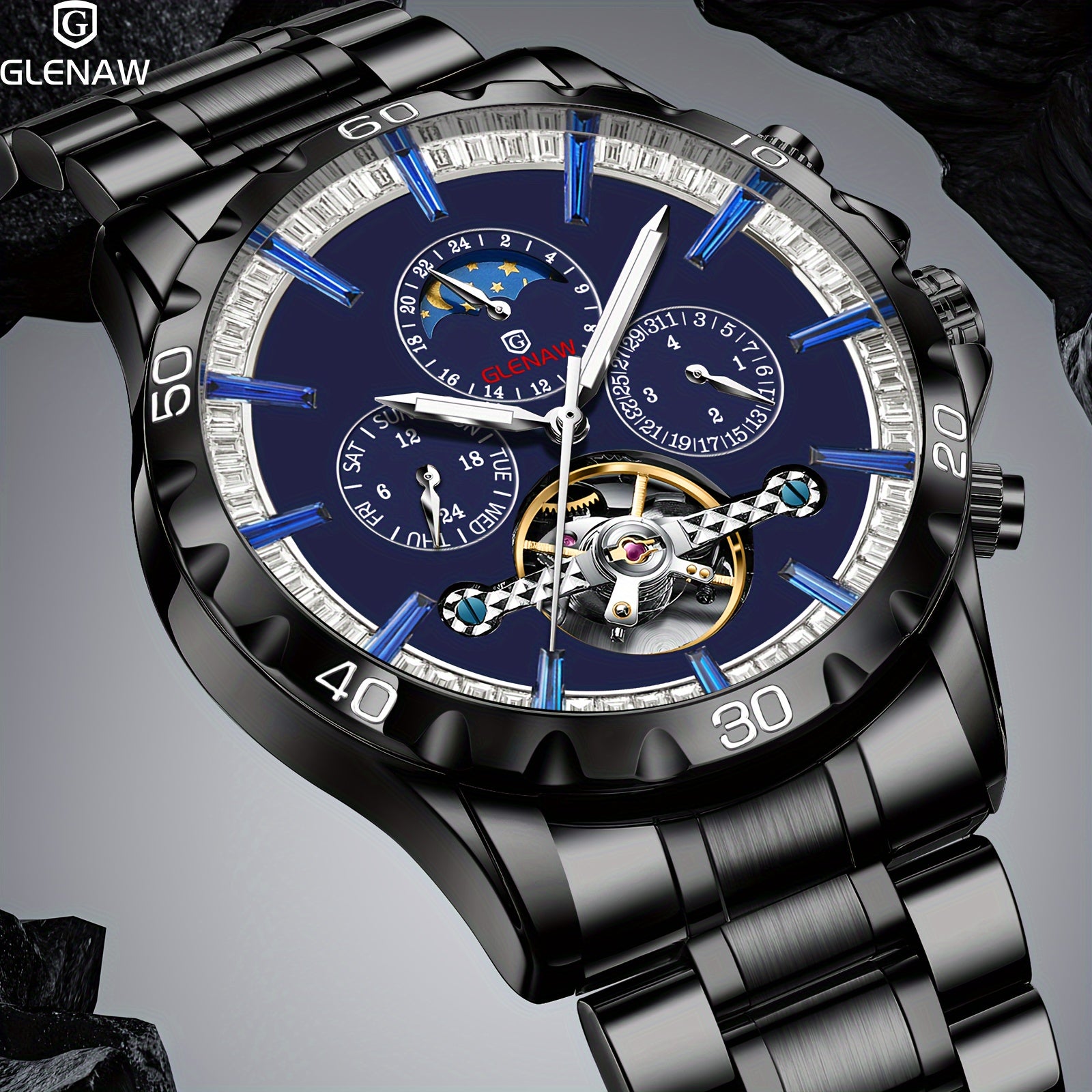 Automatic Men's Watch With Stainless Steel Strap, Multifunctional Men's Watch With Hollow Automatic Winding Mechanical Watch, Displaying Date, Day Of The Week, Month, And Stars.