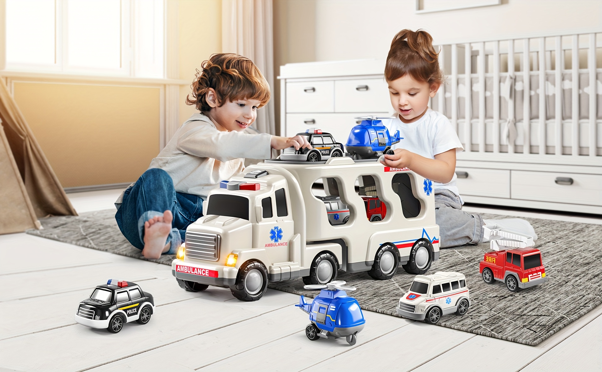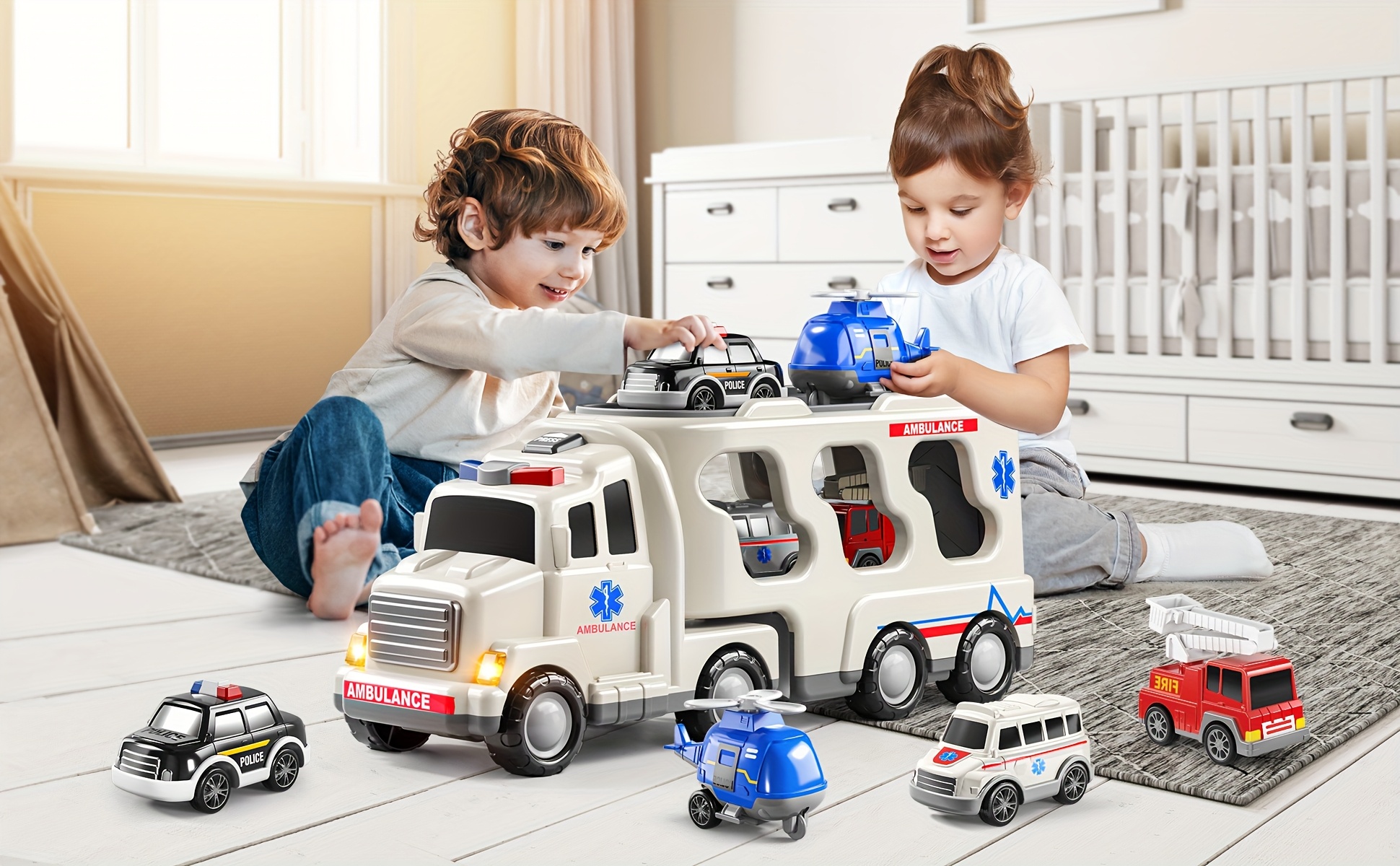 Babyhome Ambulance Truck 5 in 1 with Lighting & Sound, Friction Power Vehicle, Rescue Helicopter, Police Car, Fire Truck, Ambulance, Christmas, Birthday Gift, Interactive Toy Combination Toy Car