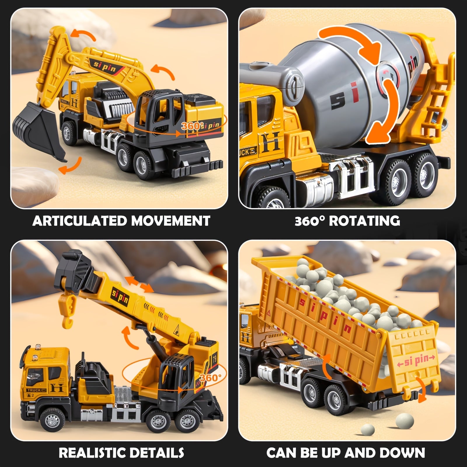 MULTIFUNCTIONAL ALLOY CONSTRUCTION VEHICLE TOYS FOR KIDS: Includes Crane Truck, Excavator Truck, Dump Truck, and Cement Mixer Truck, designed to spark the child's curiosity with various models. DURABLE DESIGN: Made from robust metal and plastic materials featuring lifelike details. METAL CAB, high-quality plastic body and chassis, and genuine rubber tires. REALISTIC ENGINEERING VEHICLE MODELS: The toy Excavator's workbench can rotate 360 degrees, and the mechanical arm is capable of flexible up and down movement.