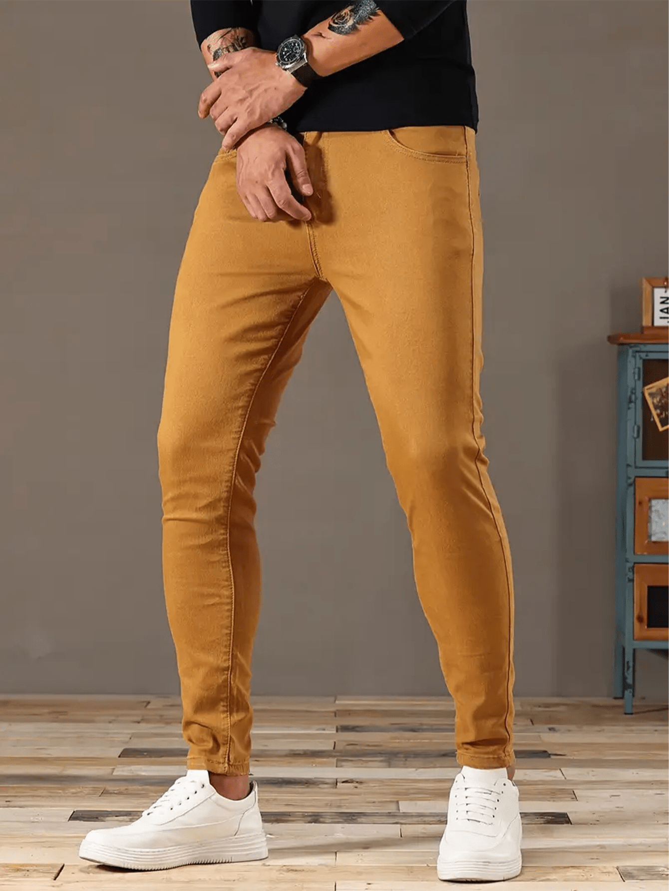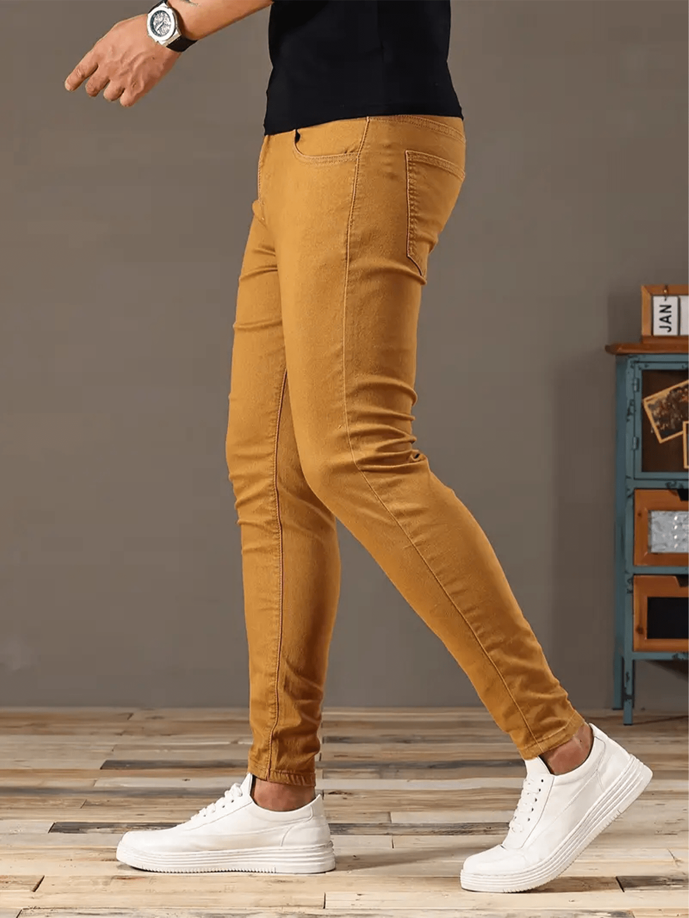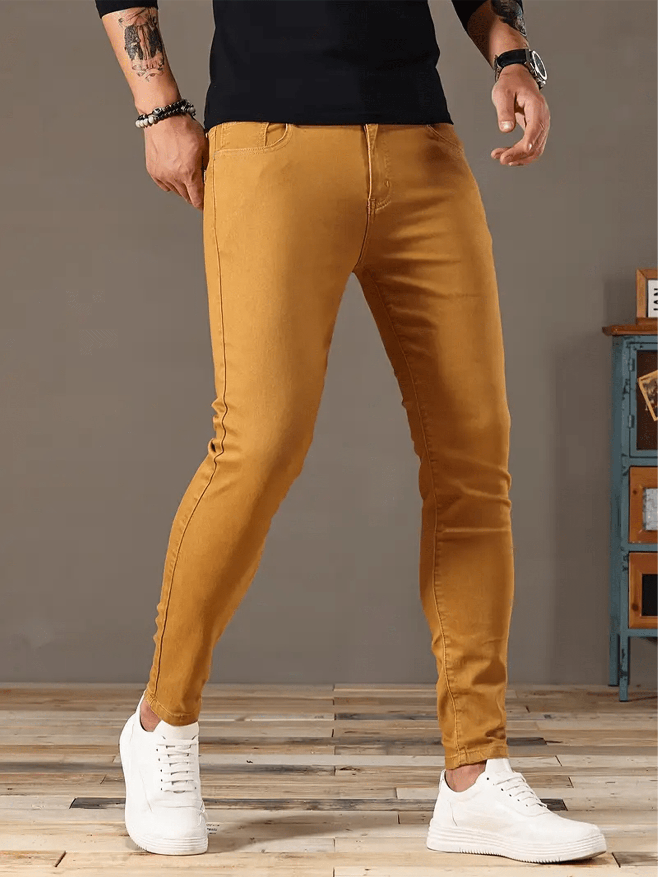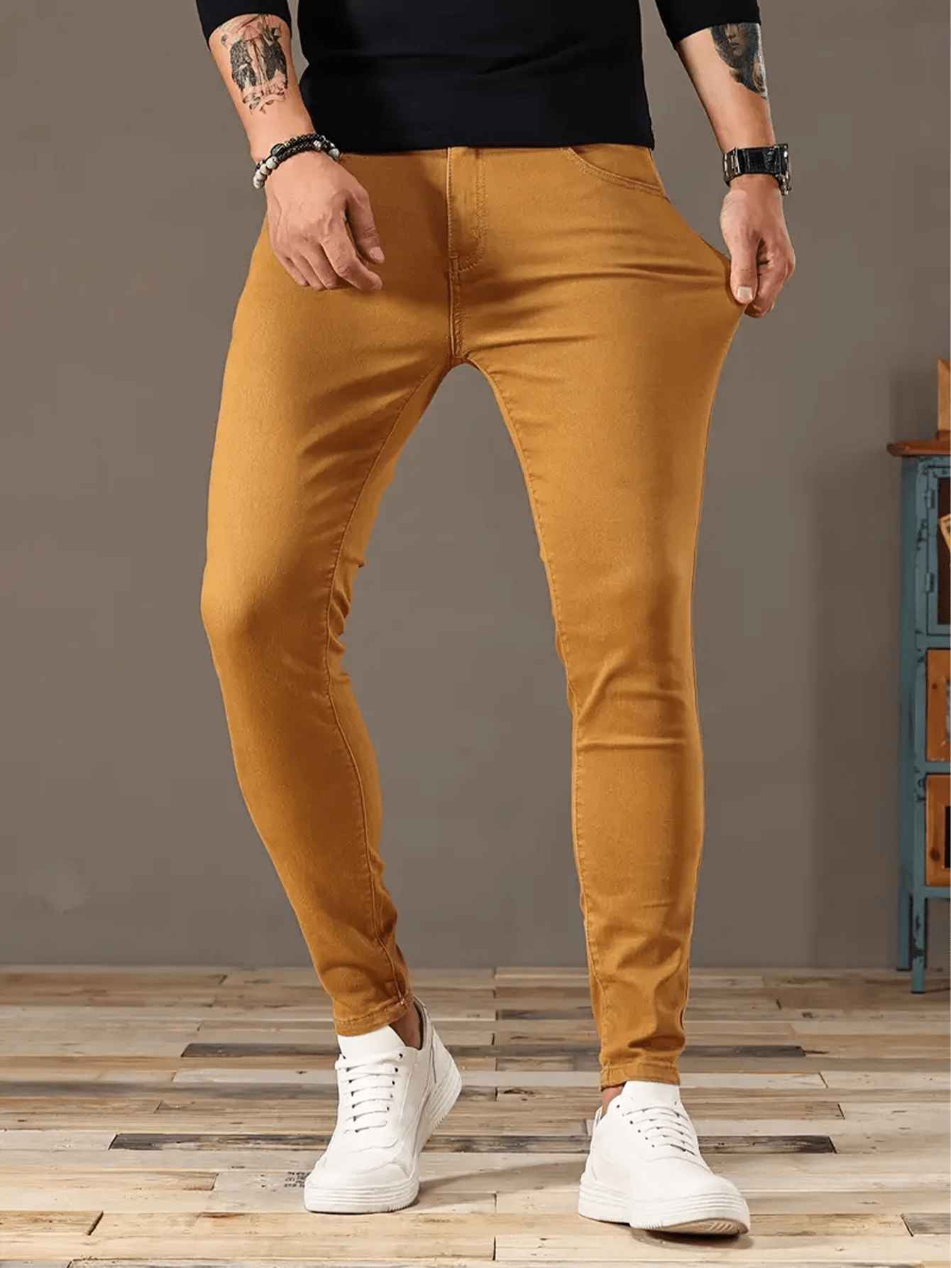 Fashionable long pants Slim-fit jeans Men's jeans with durable fabric, stretchy long pants style, cycling Men's pants, business casual brown long pants