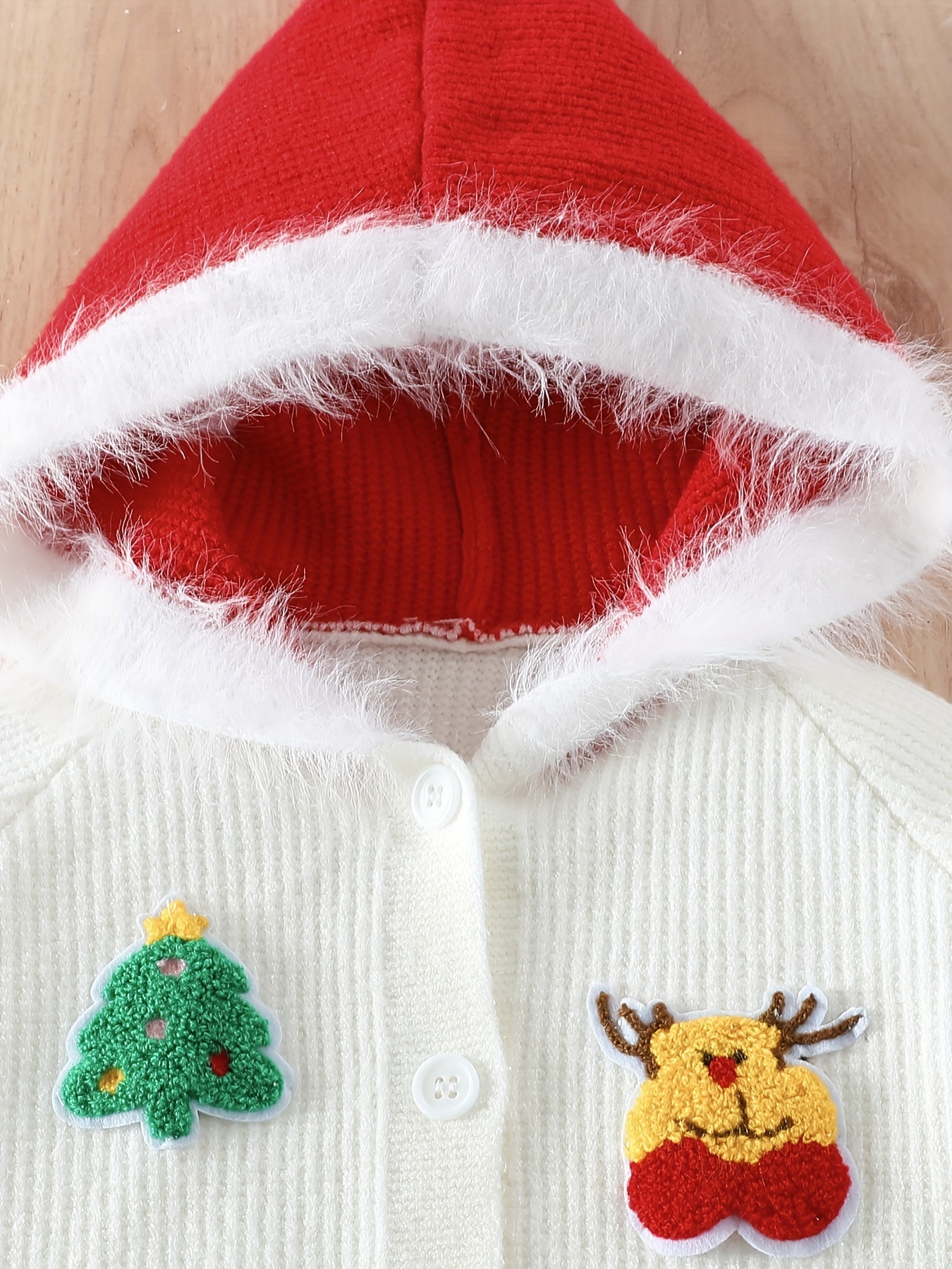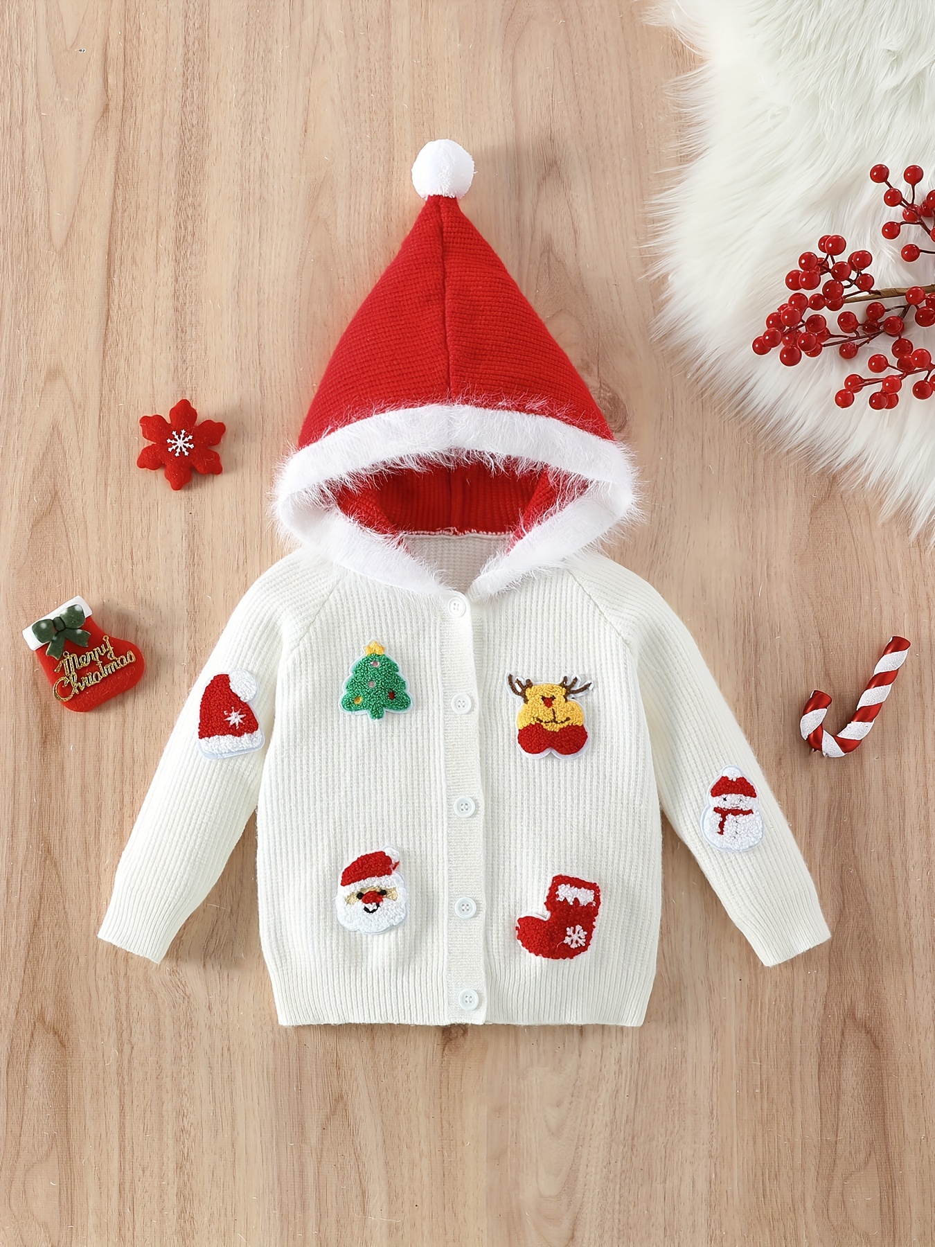 Girls' Christmas-Themed Knit Cardigan with Red Santa Hat & Festive Embroidery - Long Sleeve, White with Holiday Decorations, Perfect for Fall/Winter, Christmas Clothes for Girls
