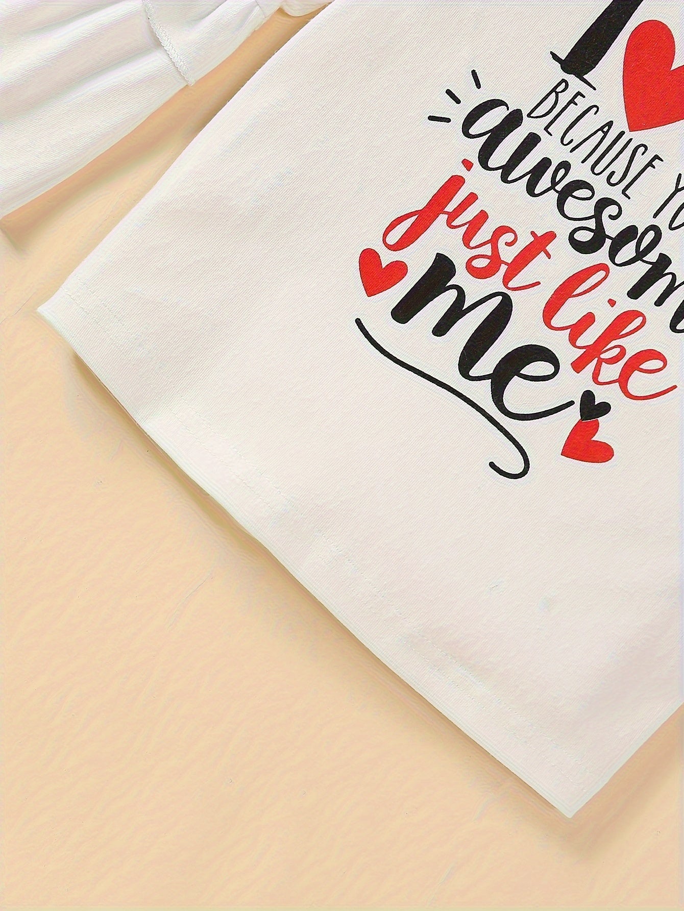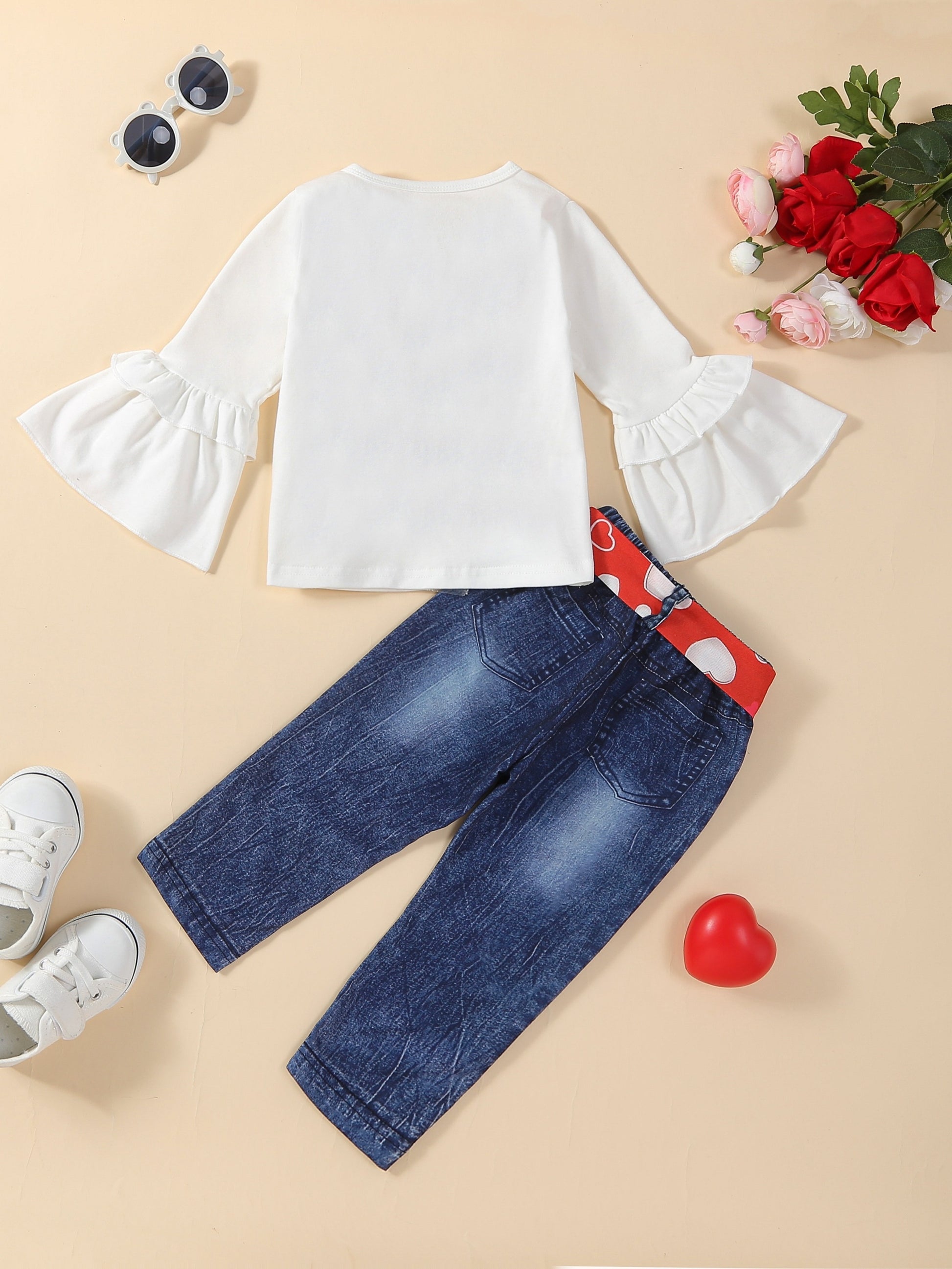 Girls' Spring and Autumn Fashion Set Girls' Flared Long Sleeve Letter Love T-Shirt Top Anti-Denim Pants Set with Belt, Perfect for Outdoor