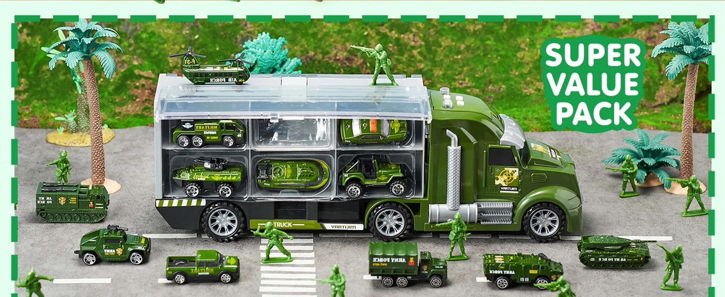SUPER VALUE. 12 mini military army truck toy set in different designs and functions in one carrier truck. Including 12 featuring plastic soldiers figure, helicopters, tank, armored car, long truck, hovercraft, pickup truck, and so on.