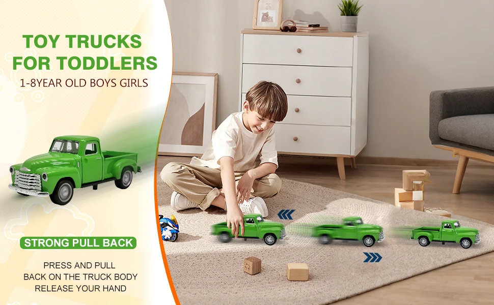 Pull-Back Toy Truck: Our little Green truck toy runs without batteries, uses a rear-wheel pull-back device, making it easy to place on the ground and gently press and pull back to let it go,so you don't need to worry about running out of power