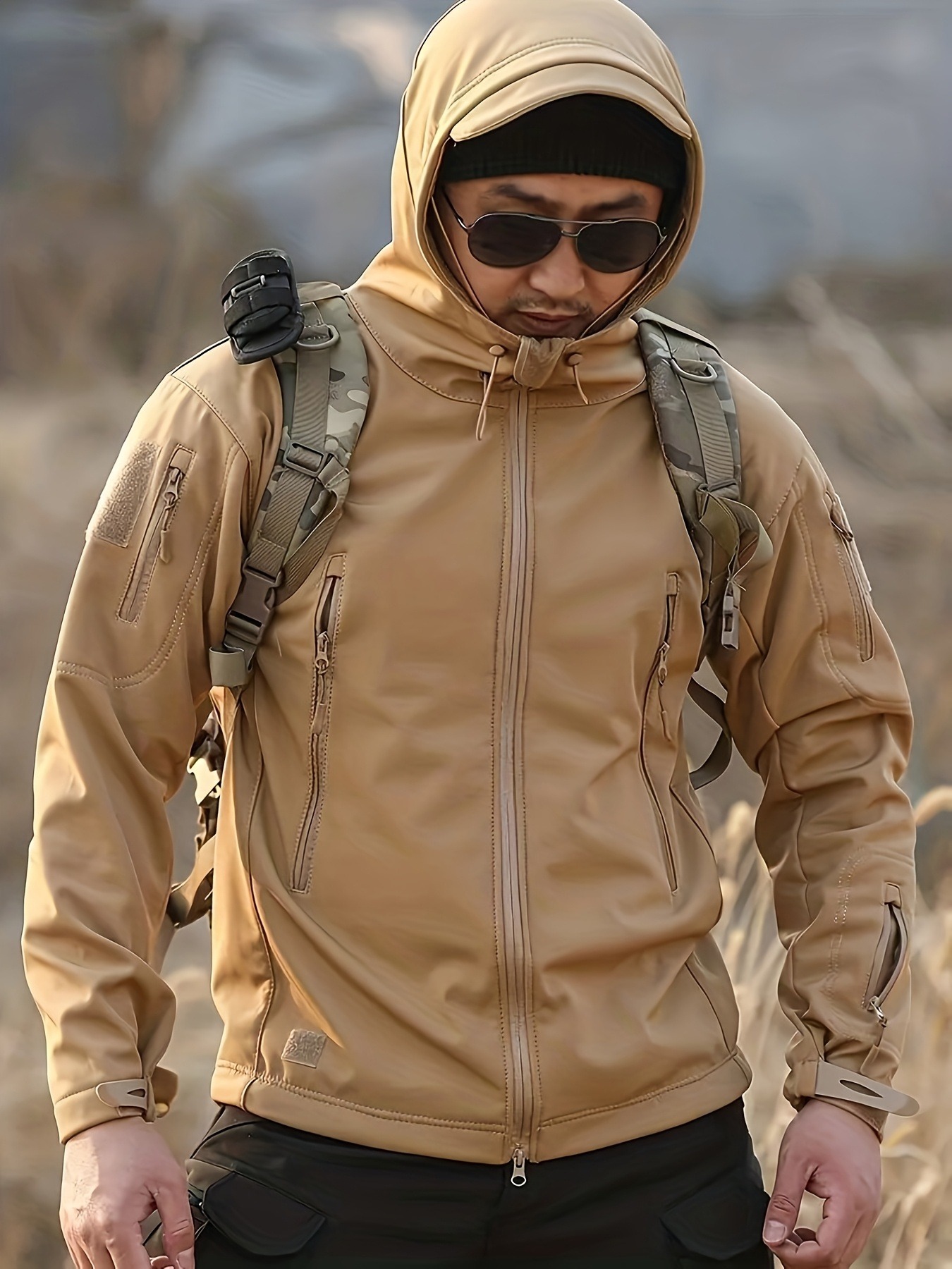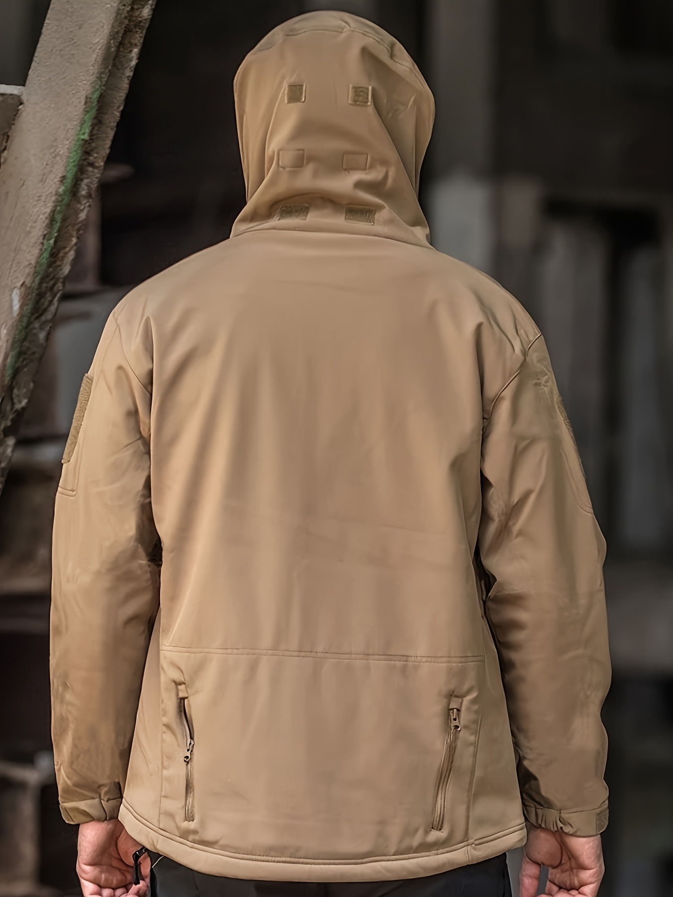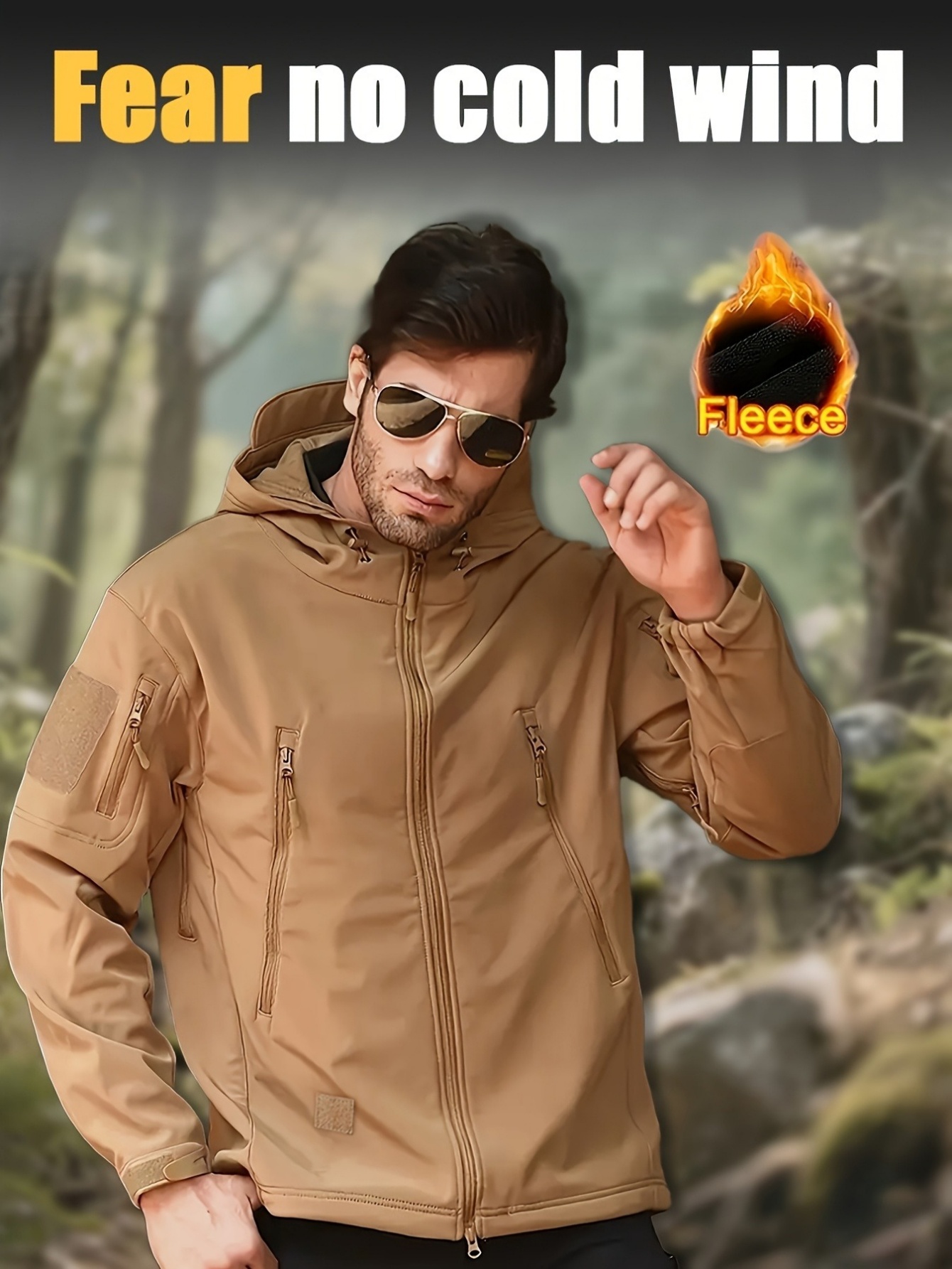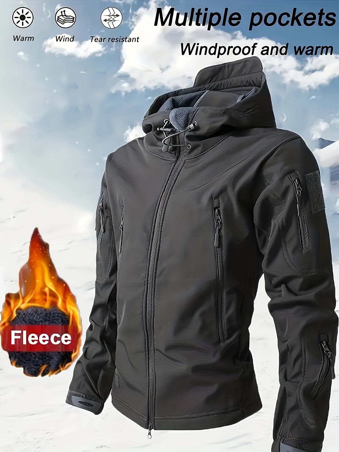 Men's Heavy-Duty Windproof Insulated Tactical Winter Jacket with Full-Zip Hooded Softshell Coat, Multiple Pockets & Zippered Pocket Flap - Machine-Washable Outdoor Survival Gear for Hiking, Skiing, Hunting, Camping (Black) -