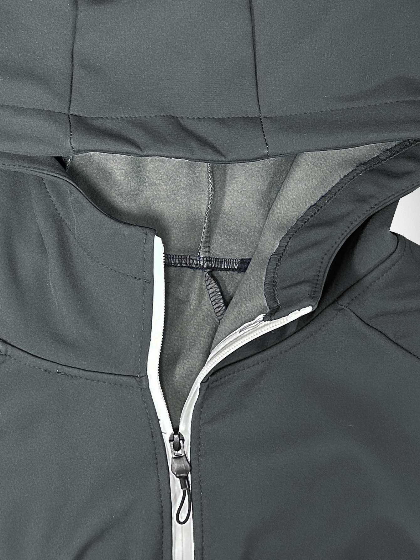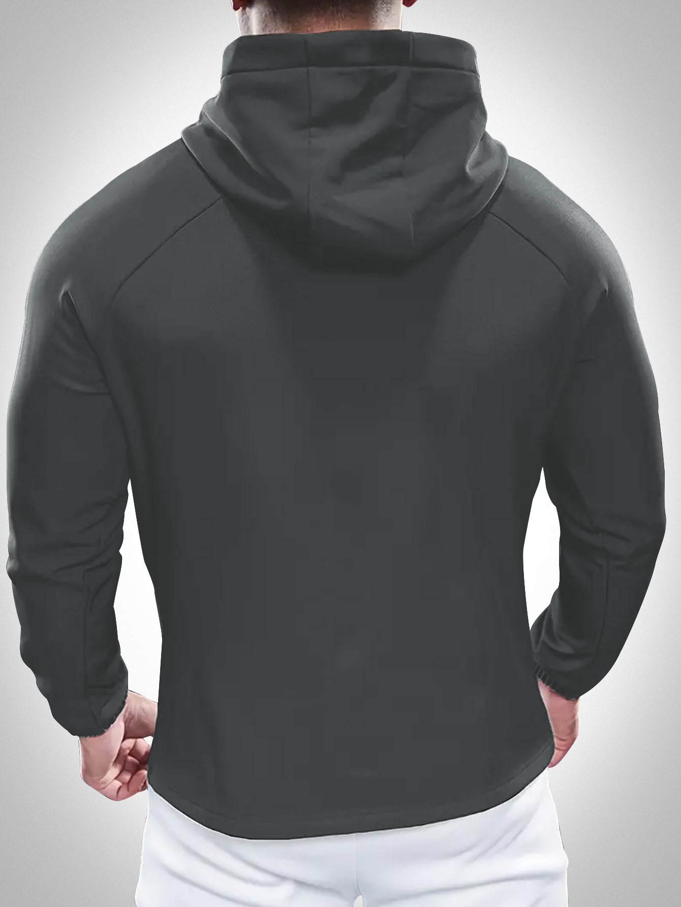 Men's athletic jacket with a full zipper and hood, designed for workouts, fishing, and hiking, featuring long sleeves.