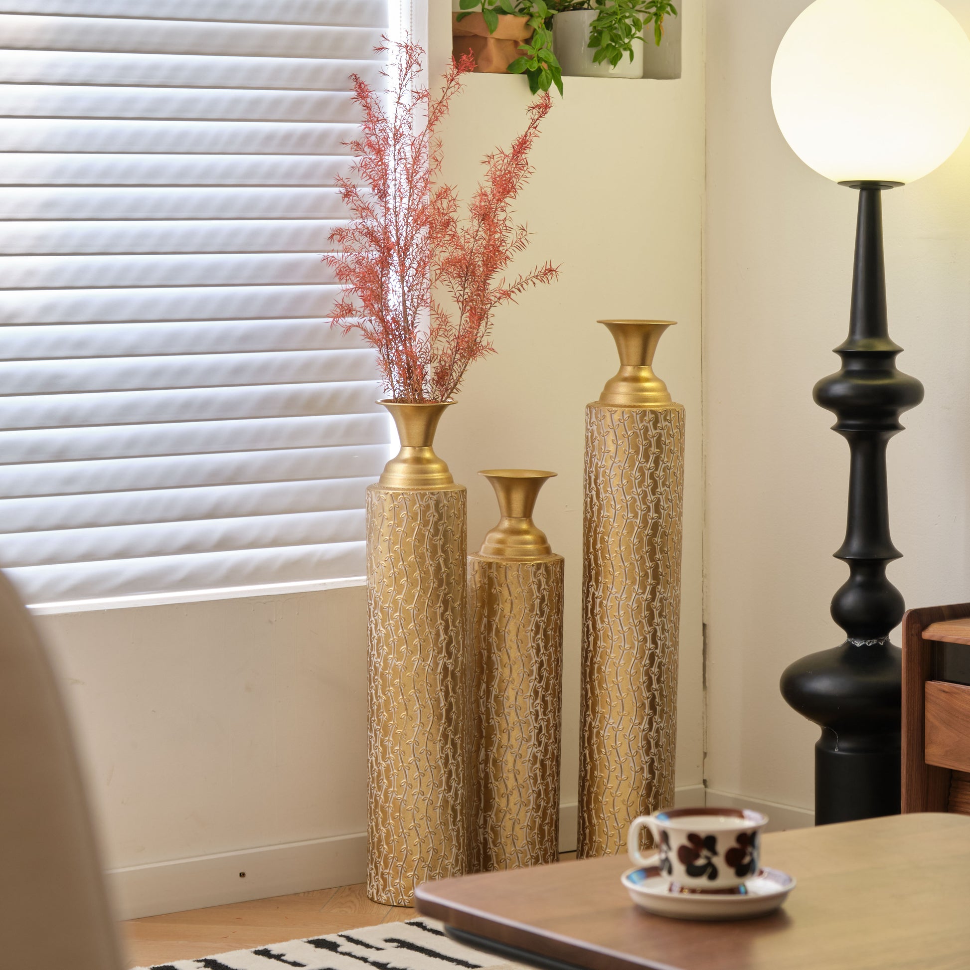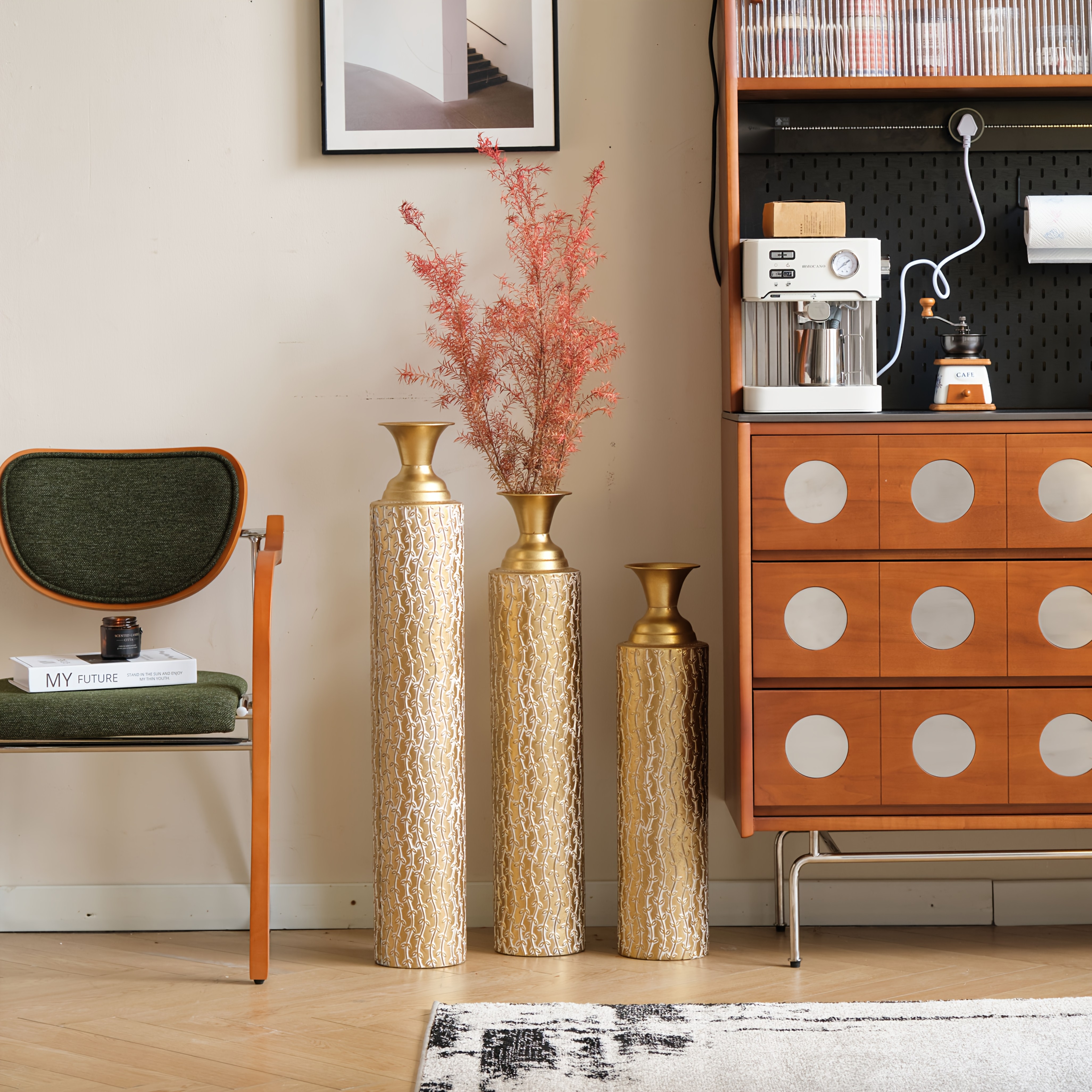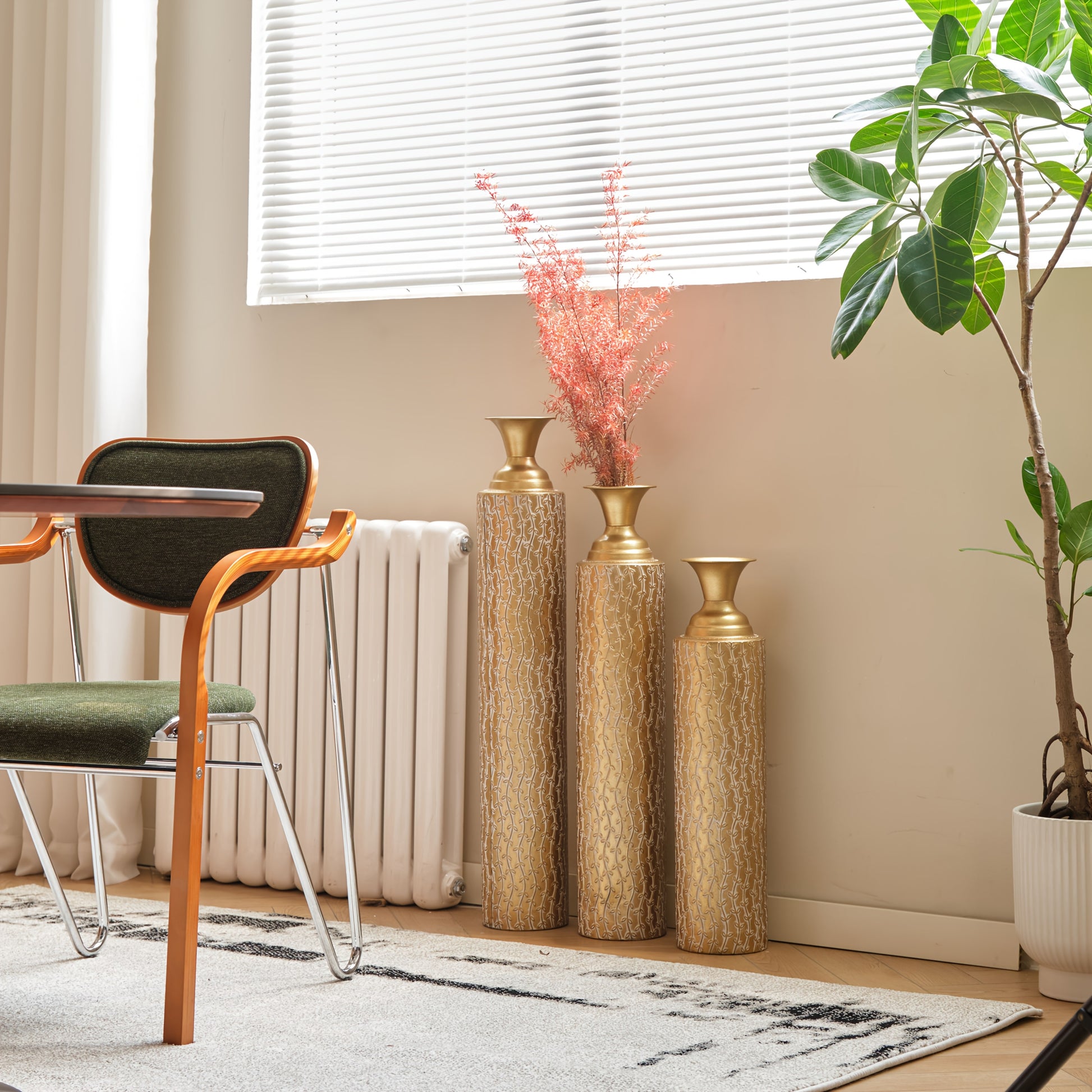 SET OF THREE ROUND VASES FOR HOME DECORATION: This iron trio features beautifully etched swirl designs that enhance sophistication. The three large decorative vases come in different sizes: small at 6 inches by 25 inches, medium at 6 inches by 29 inches, and large at 6 inches by 34 inches, with a total weight of 15.21 pounds.