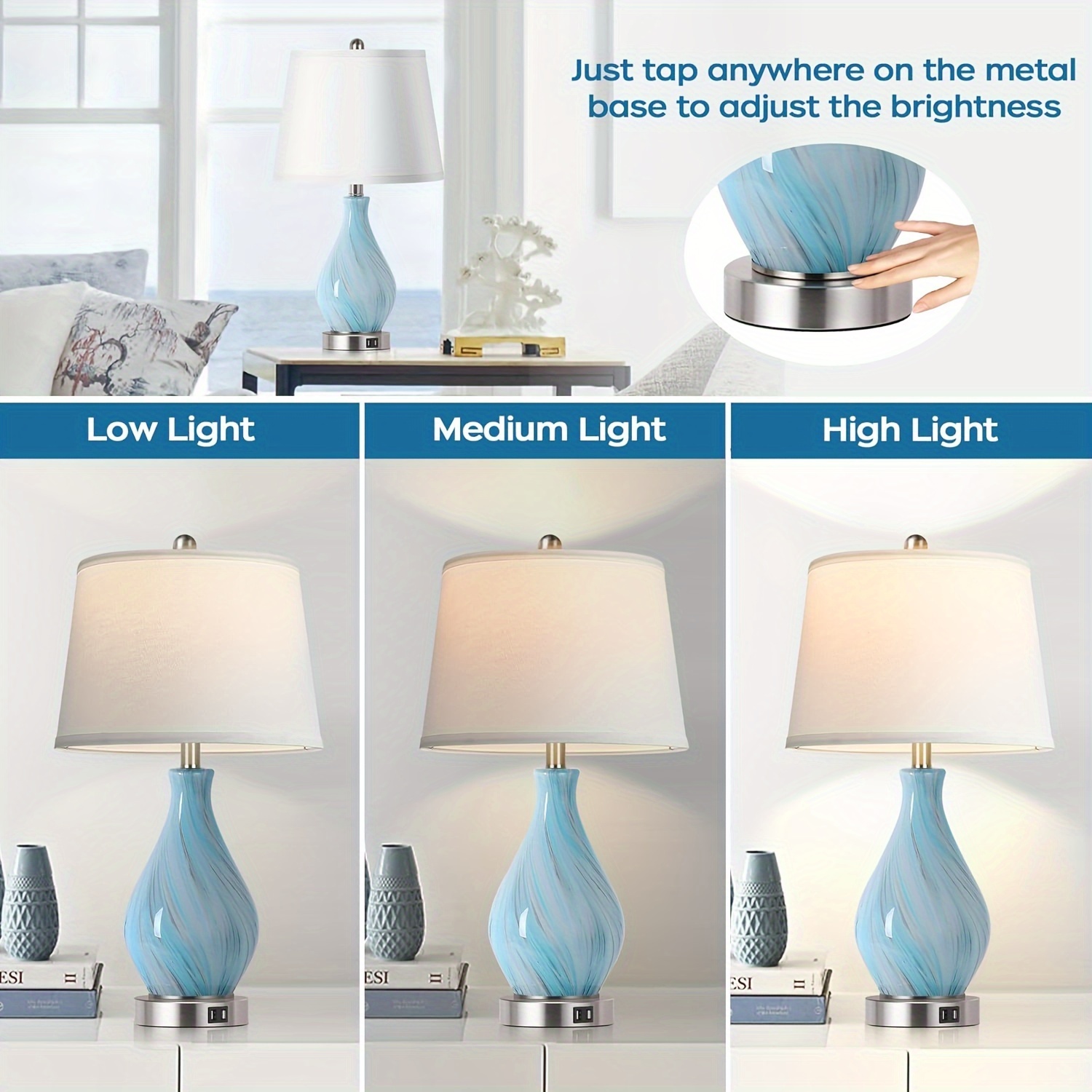 Table Lamp Set Of 2 Touch Control, 22" Faded Swirl Blue Gray Art Glass With USB Ports