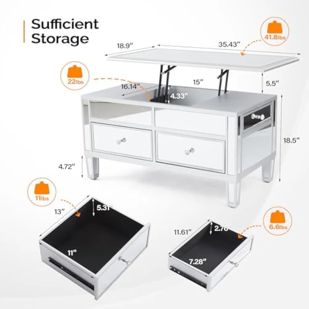 This coffee table offers a quick and easy assembly process that requires only the legs and a knob to install. It comes with clear instructions and necessary tools, making it accessible for anyone to set up with minimal effort. The design of this mirrored coffee table features a reflective surface, curved edges, and crystal drawer knobs, which add a touch of glamour and luxury to any room. The mirrored surface not only catches and plays with light to make the room appear brighter and more spacious, but it also works well with various color schemes and design themes, from modern to vintage. The table's hydraulic lifting strut is cushioned, ensuring a smooth and safe operation when adjusting the height of the tabletop. This feature allows for versatile use, whether you're using it as a regular coffee table or raising it for dining or working. The 130N hydraulic lift is durable and stable, providing ample support for the tabletop and ensuring it can handle the weight of items placed on it without wobbling. Storage is enhanced with a combination of two small side drawers and two large drawers, which help keep belongings organized and out of sight. There's also a hidden compartment under the tabletop for additional storage of items like magazines or remote controls. Each drawer is equipped with soft-close slides, making them easy to open and close quietly, reducing noise and extending the life of the drawers. The coffee table is made from premium materials, including durable mirror, sturdy solid wood, and quality MDF board. The mirrored surfaces are easy to clean and maintain, while the solid wood legs provide exceptional stability and weight-bearing capacity. The tabletop can support up to 41.8 lbs, with the larger drawer accommodating up to 11 lbs and the smaller drawer up to 6.6 lbs, ensuring a robust storage solution. We offer a Worry-Free 24-Month Quality Warranty for this mirrored furniture, along with professional customer service before and after your purchase. We respond to inquiries within 24 hours, ensuring a hassle-free shopping experience.