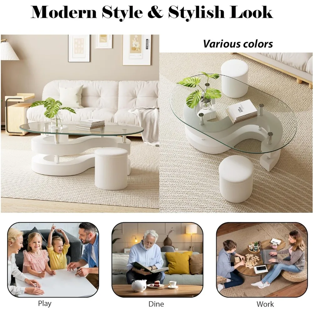 Oval Glass Coffee Table Set of 3, 0.39" Tempered Glass Top and S Shape Base, Modern Center Table with 2 Leather Stools, Accent C