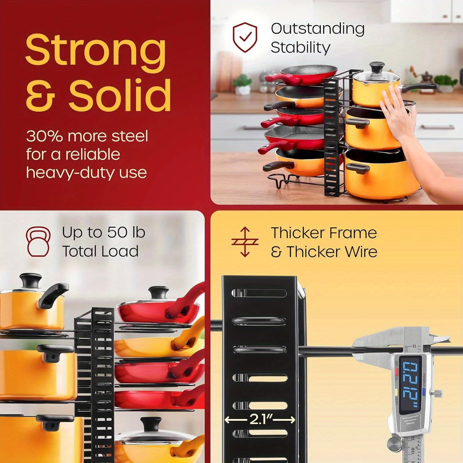 Upgraded Pots and Pans Organizer Rack for Cabinet Kitchen Storage Larger Size Pot Lids Organizer rack with 8 Tiers & 3 DIY Methods