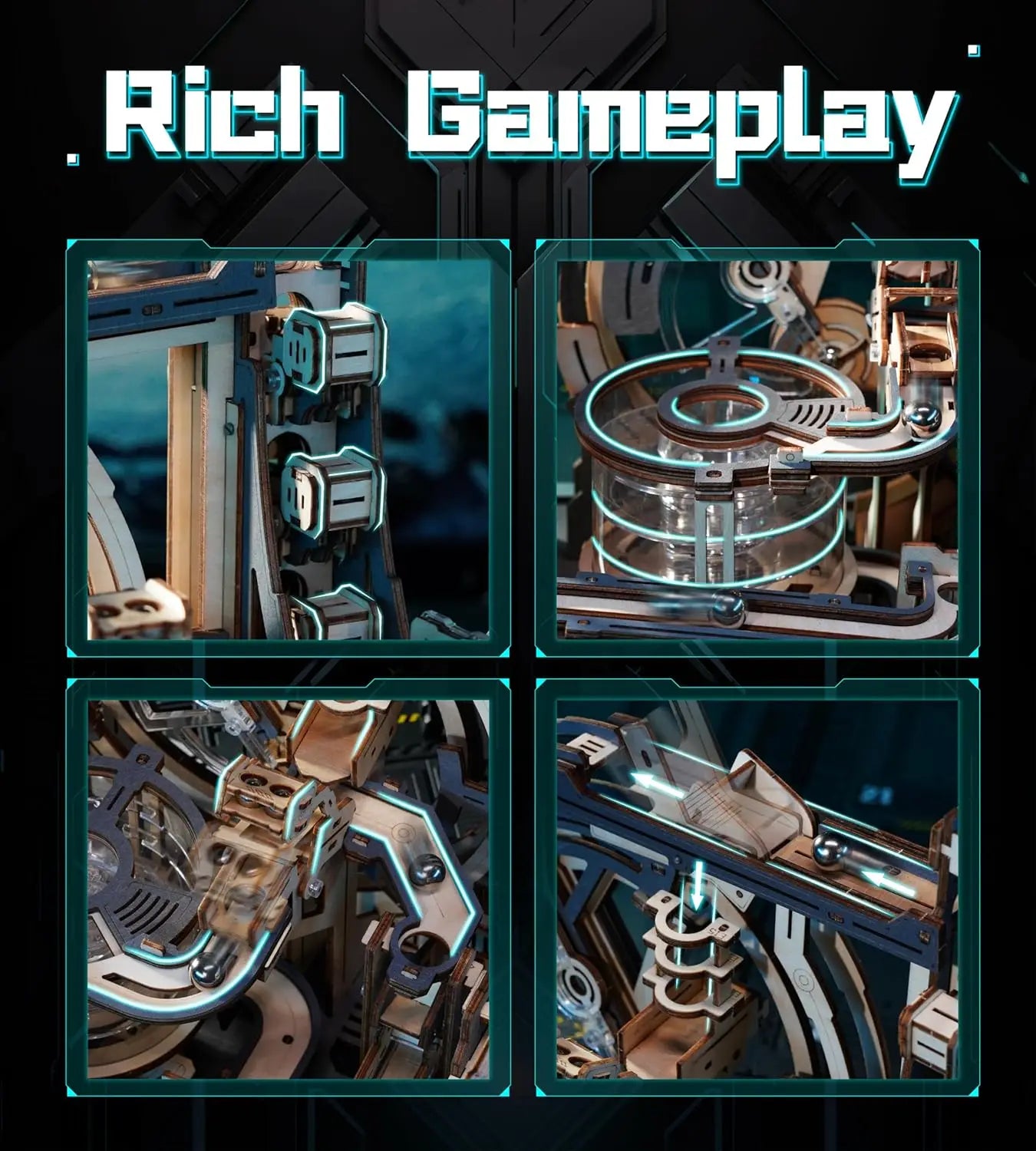 - **What You'll Get:** Everything you need for assembly is included in the accessory package, eliminating the need for glue. Our detailed instruction manual makes identifying parts and following steps a breeze. Crafted from high-quality plywood and acrylic board in striking black-grey hues, the Spaceport is visually captivating. Explore the physics behind the movement trajectory of the ball as it navigates through the puzzle.