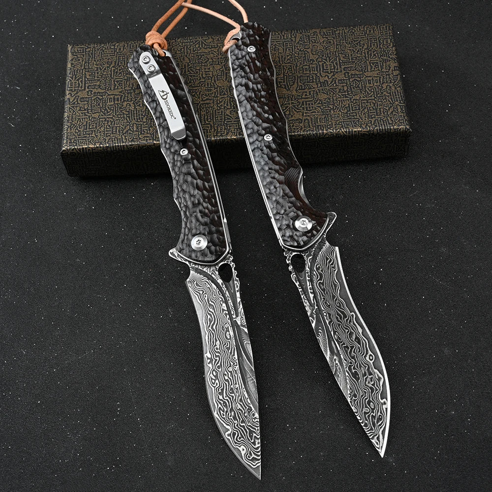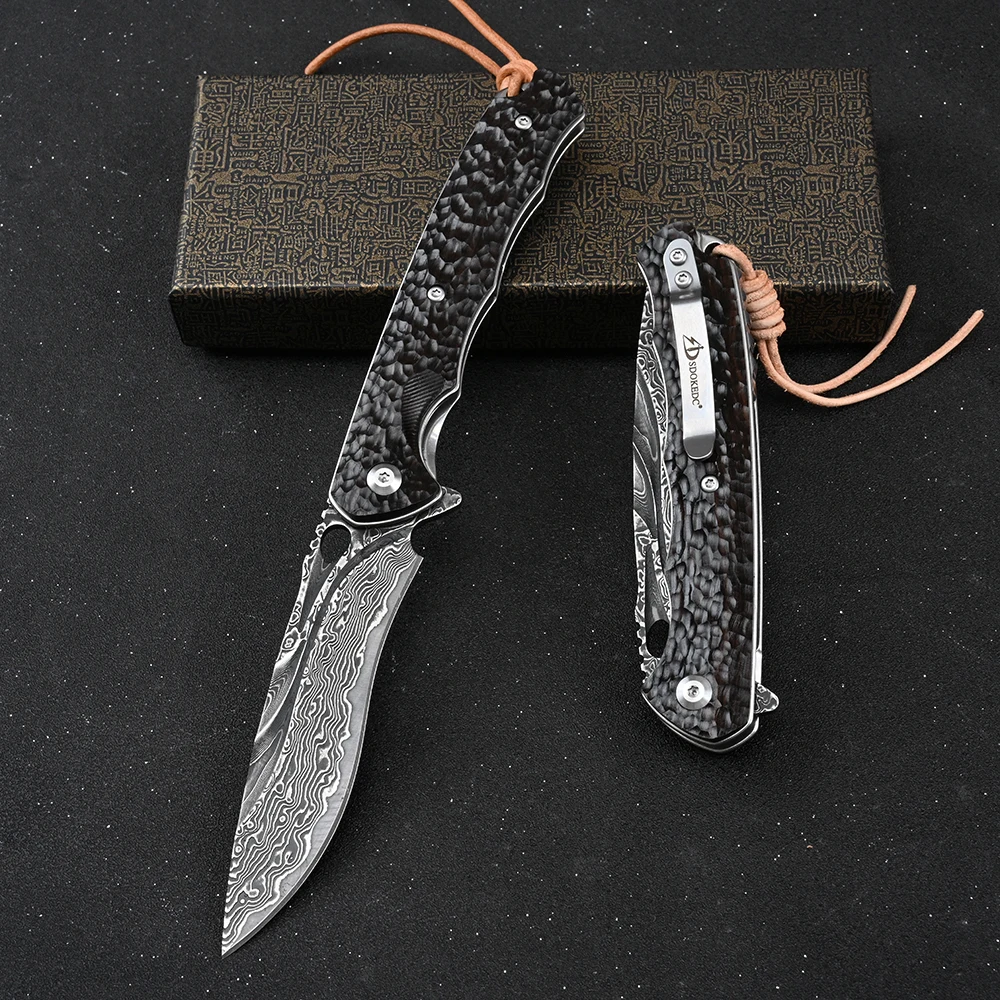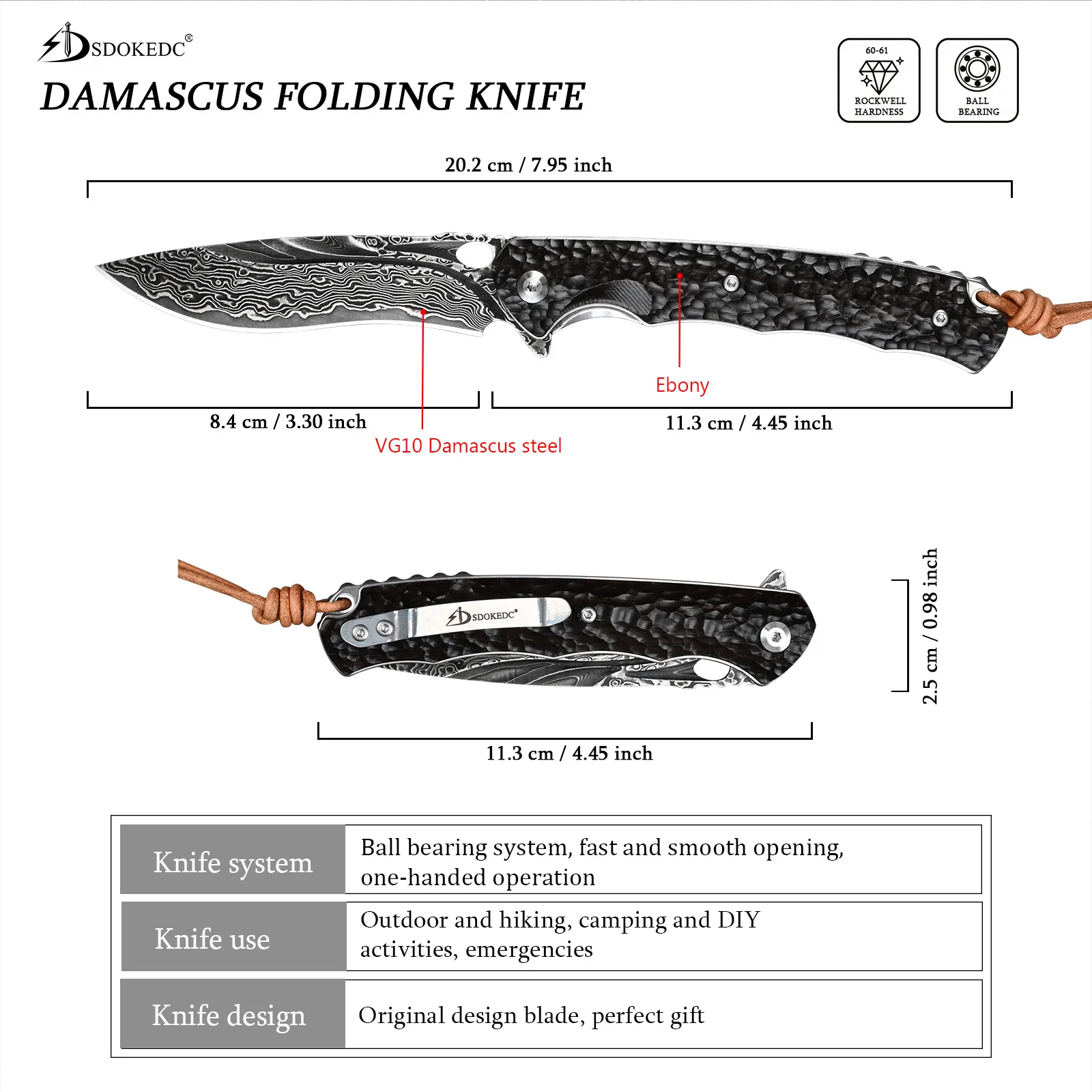 SDOKEDC Folding Knives VG10 Damascus Steel Hand Carved Ebony Pocket Knife Camping Survival Edc Multitool Utility Knife Mens Gift