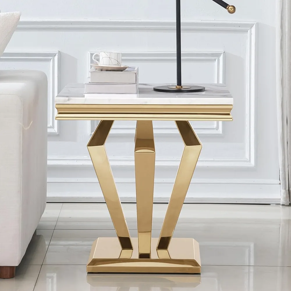 Square End Table, 22.8" Modern White Faux Marble Side Table with Golden Mirrored Finish