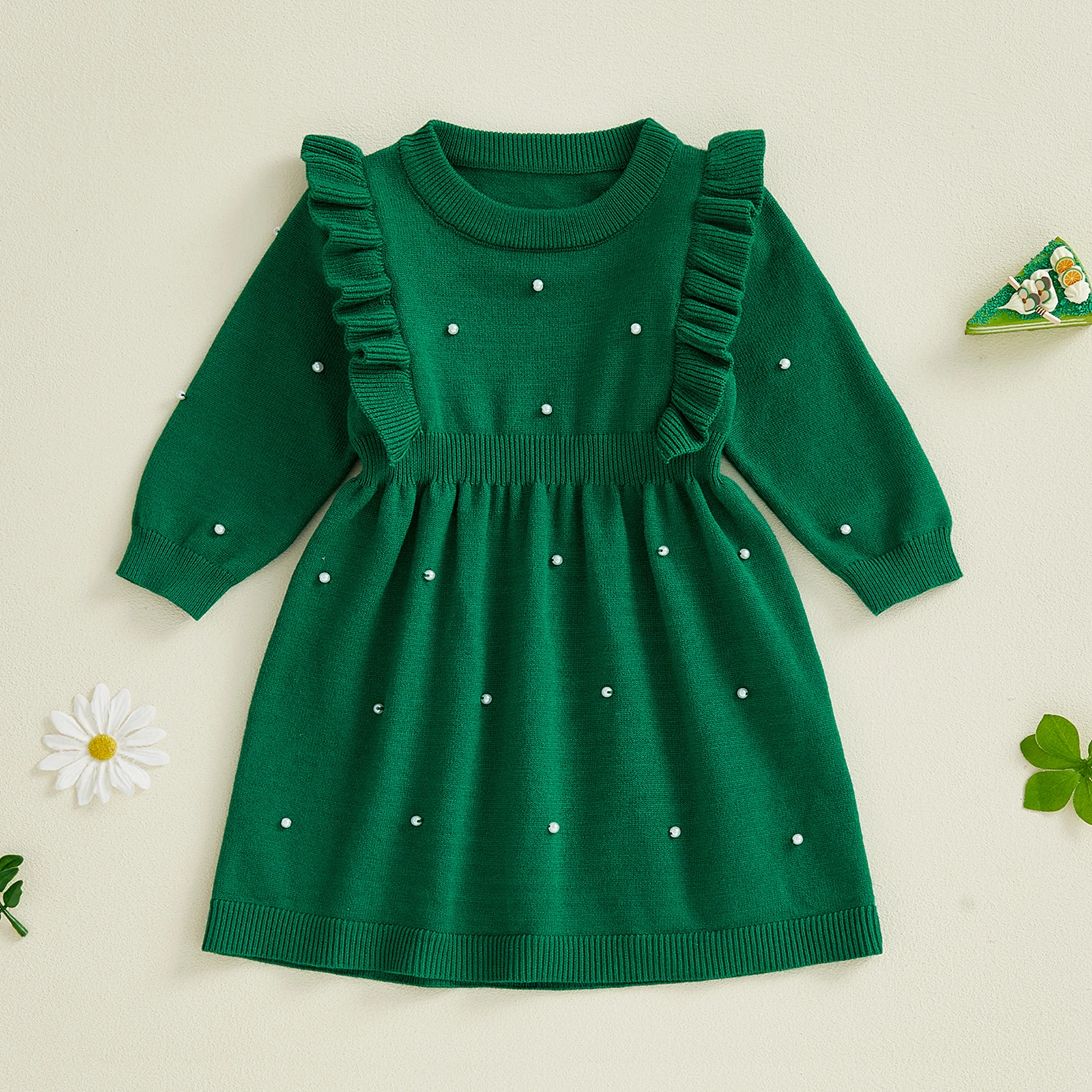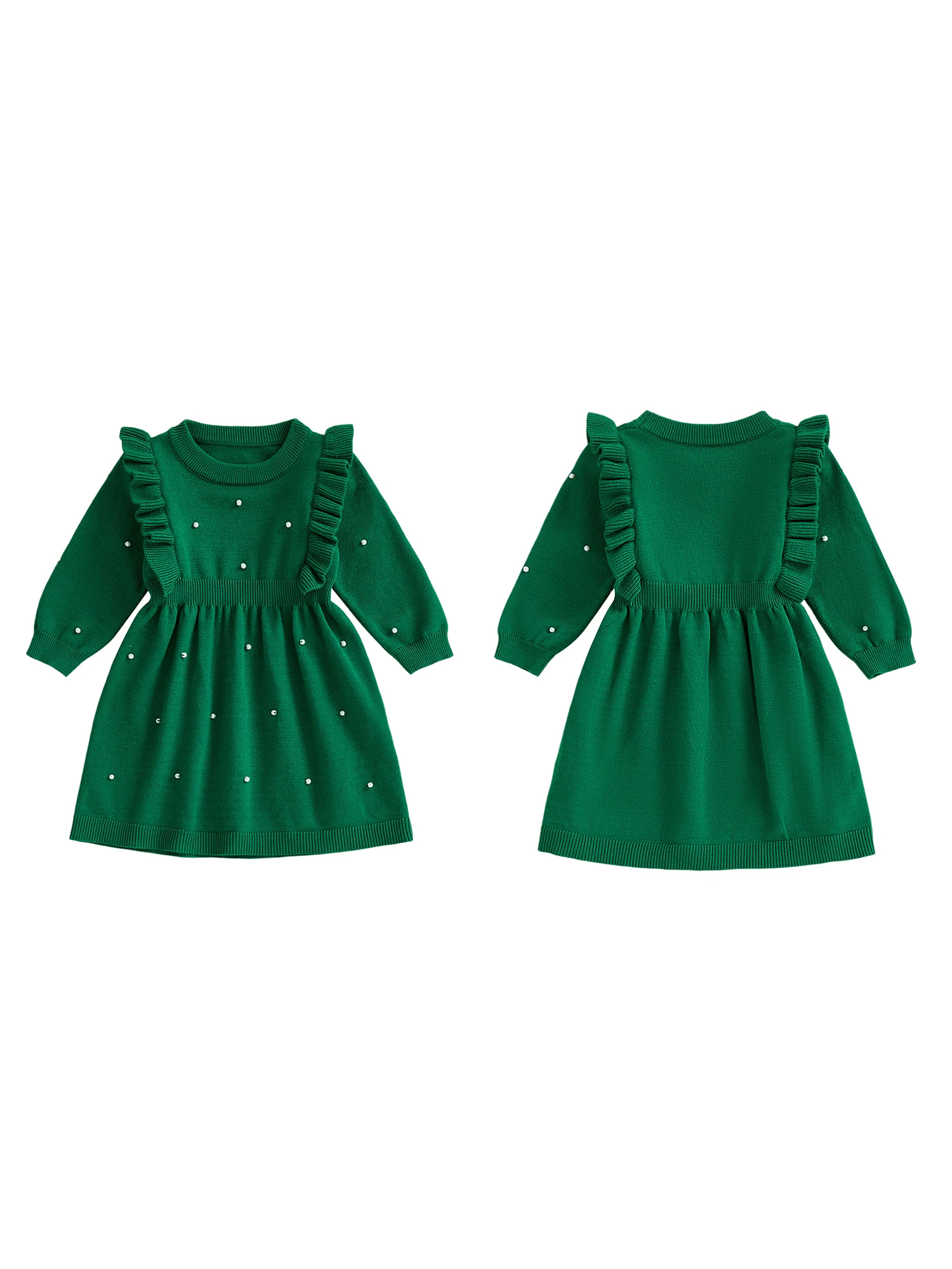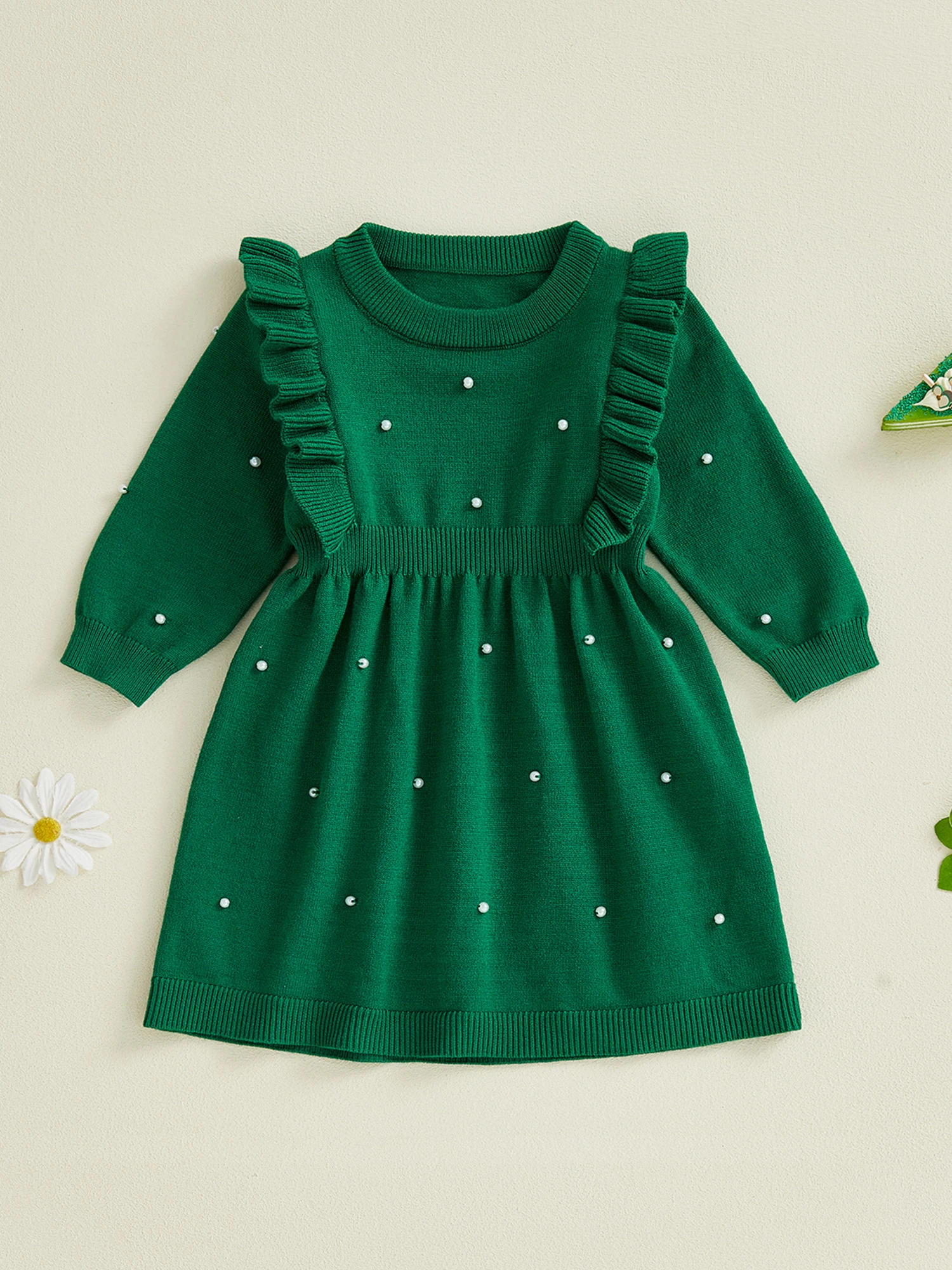 Toddler Girls Autumn Knitted Dress Fashionable Ruffle Trim Solid Color Pearl Decorated Long Sleeves Round Neck DressSize (cm):