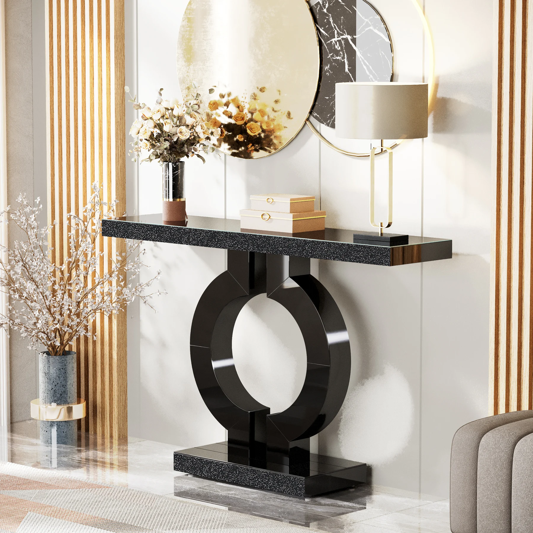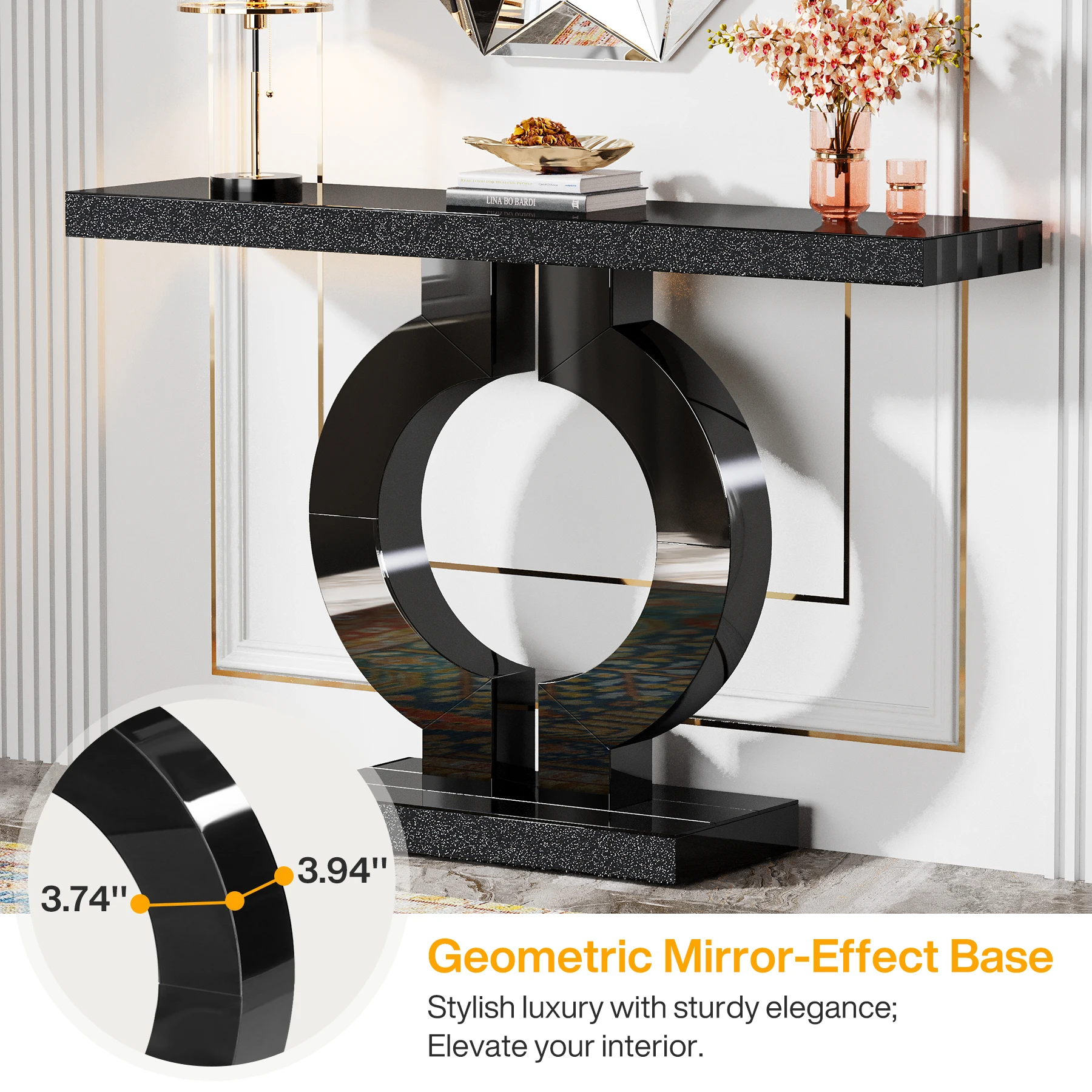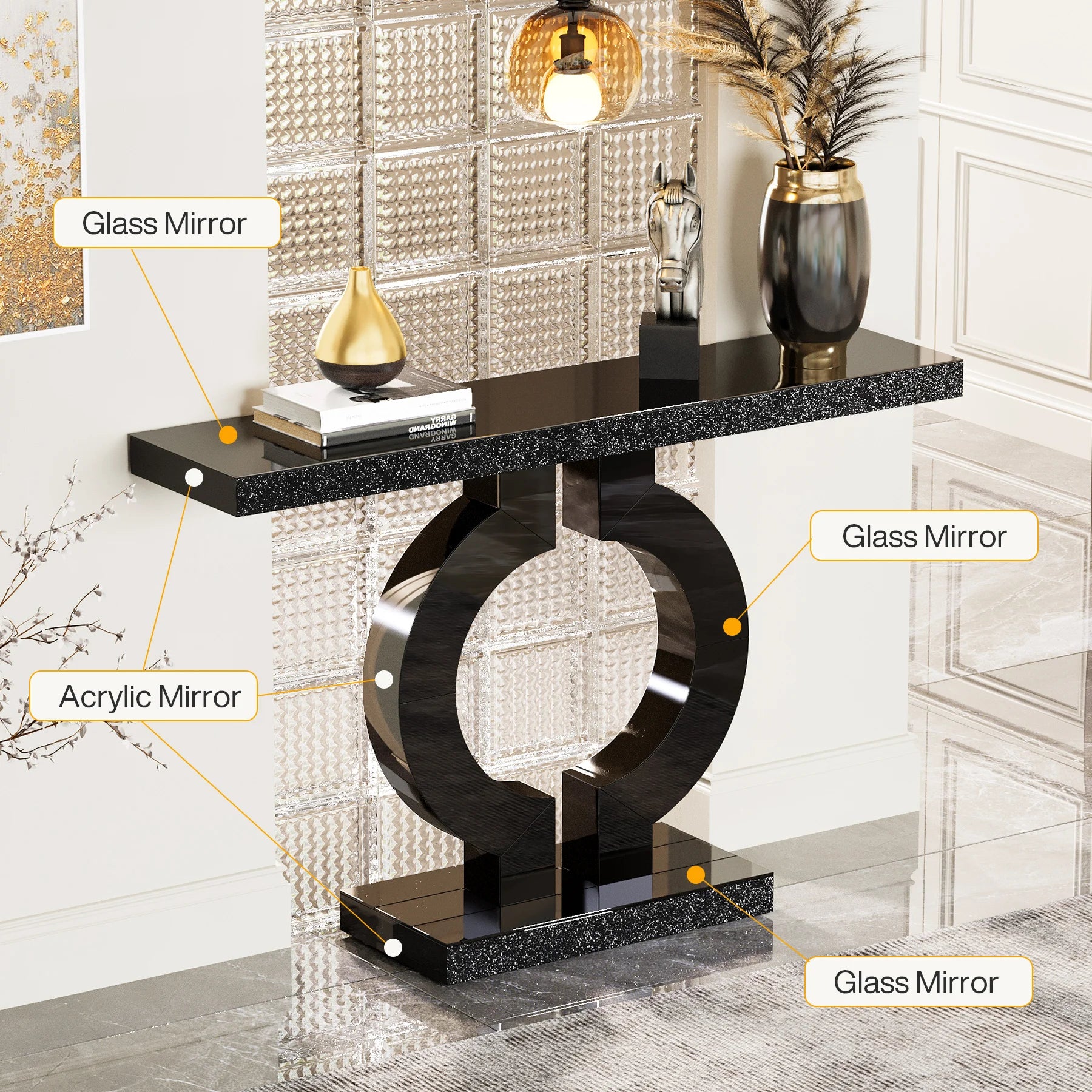 【Contemporary Mirror Design】: Our console table shines with a pristine mirrored finish and a unique O-shaped base, infusing an immediate dash of modern elegance into any space. Its design not only augments brightness and feeling of expansiveness, but also complements various décor styles, right from minimalist to lavish. The gleaming acrylic diamond veneer on its surfaces further raises its alluring appeal (The console table mirrors include surfaces made of glass and surfaces made of acrylic material)