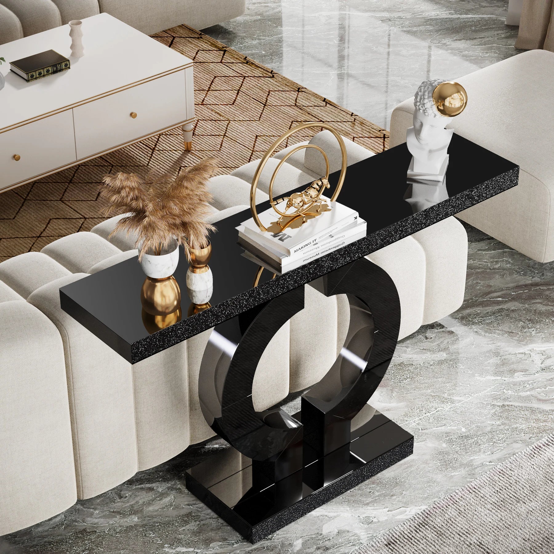 【Stylish & Useful Space】: The generously sized tabletop offers a sophisticated area to show off lamps, vases, and picture frames. Though its sleek and compact design suits smaller areas, the table's distinct geometric design ensures it stands out irrespective of the space