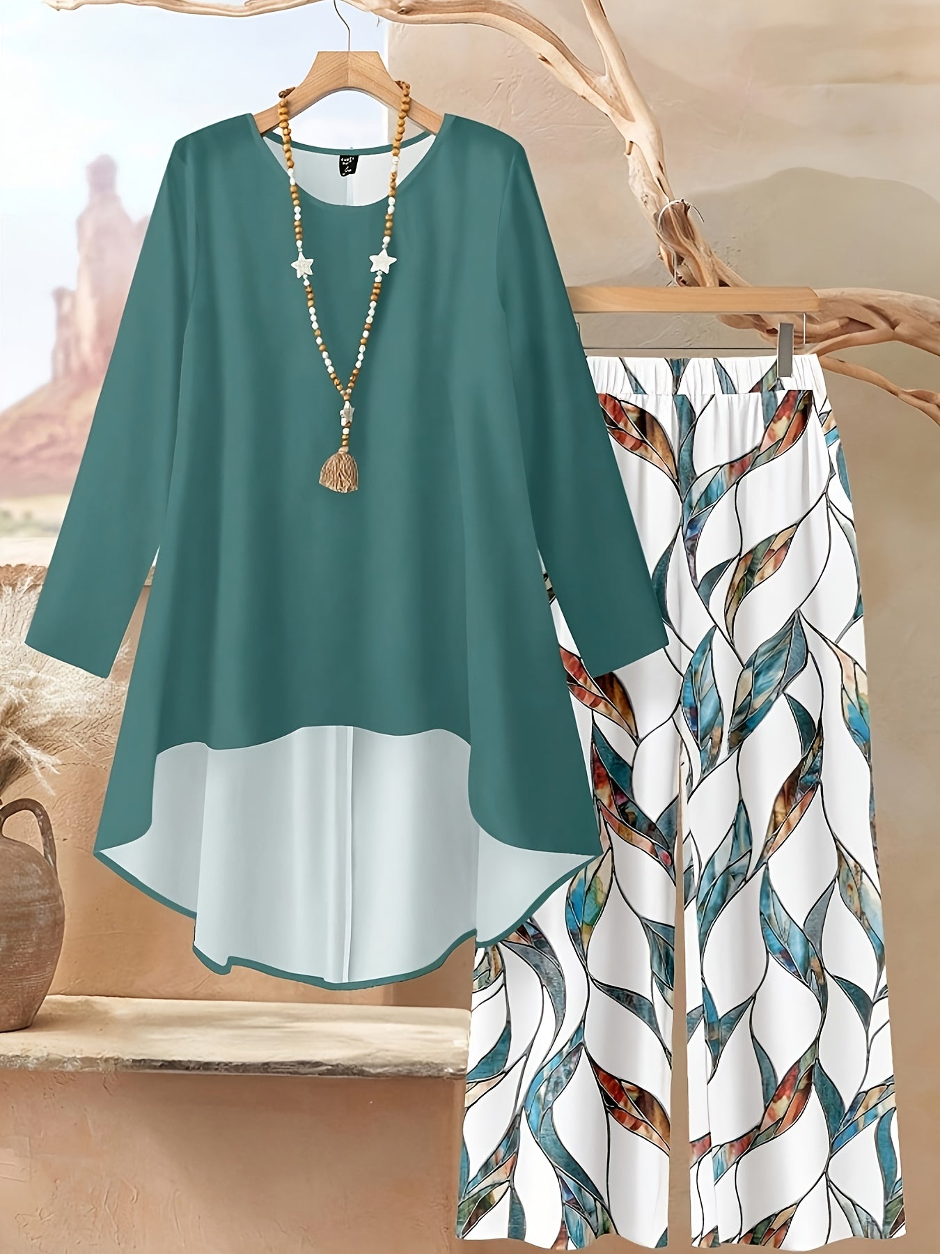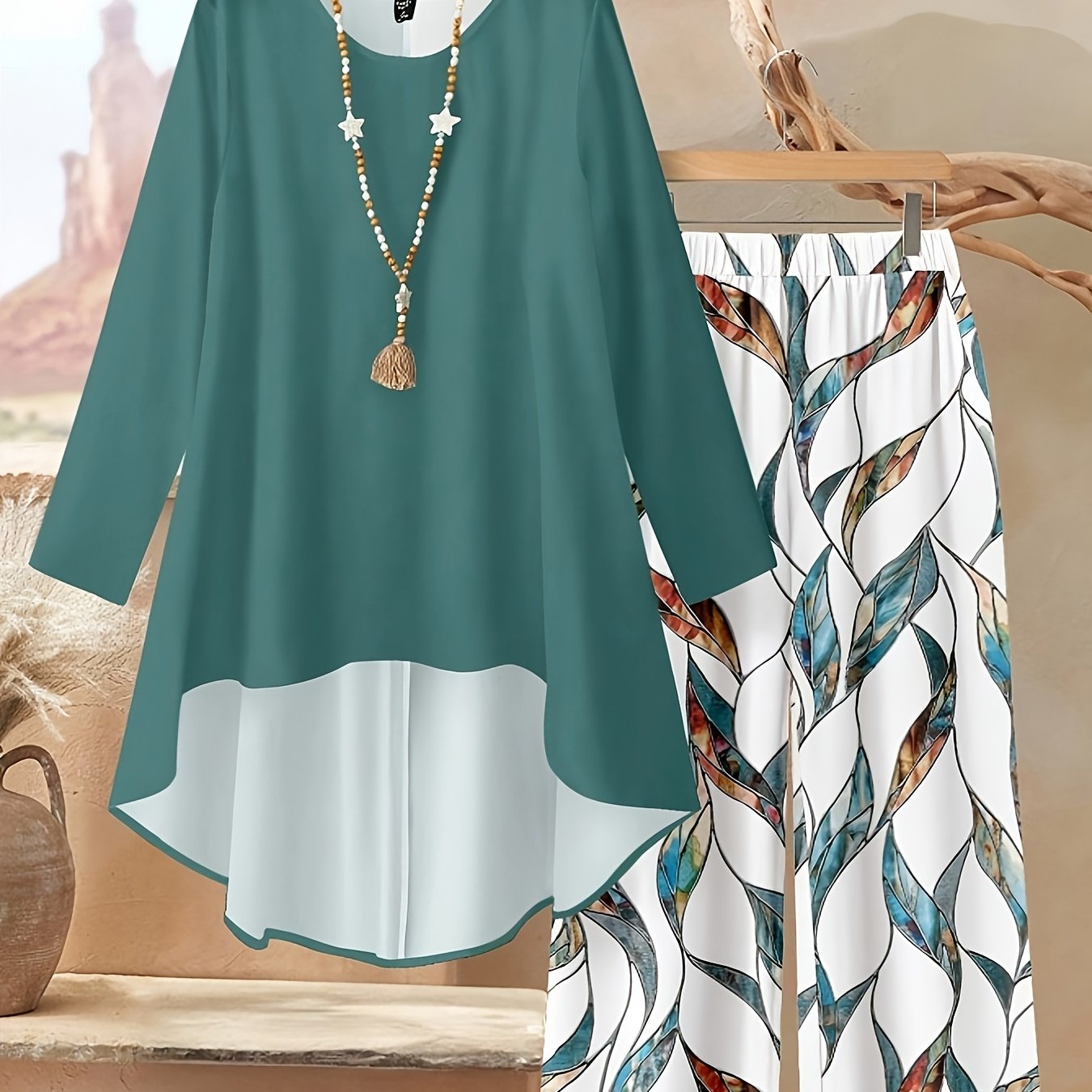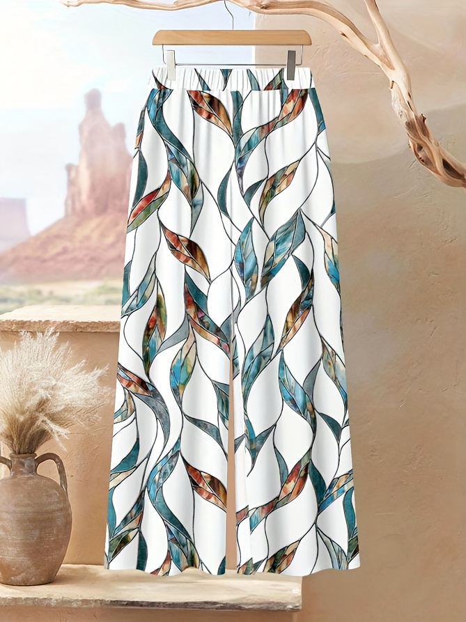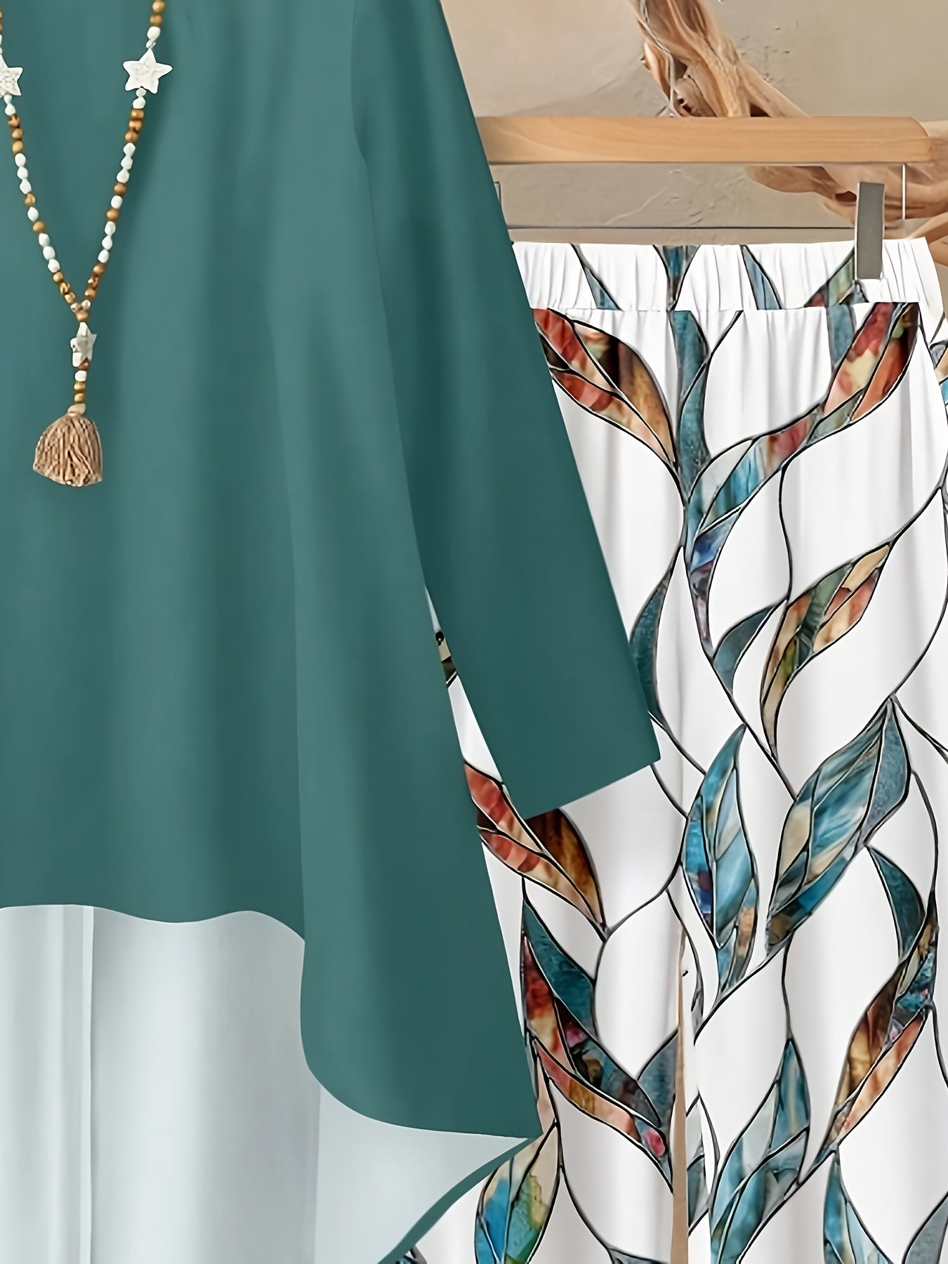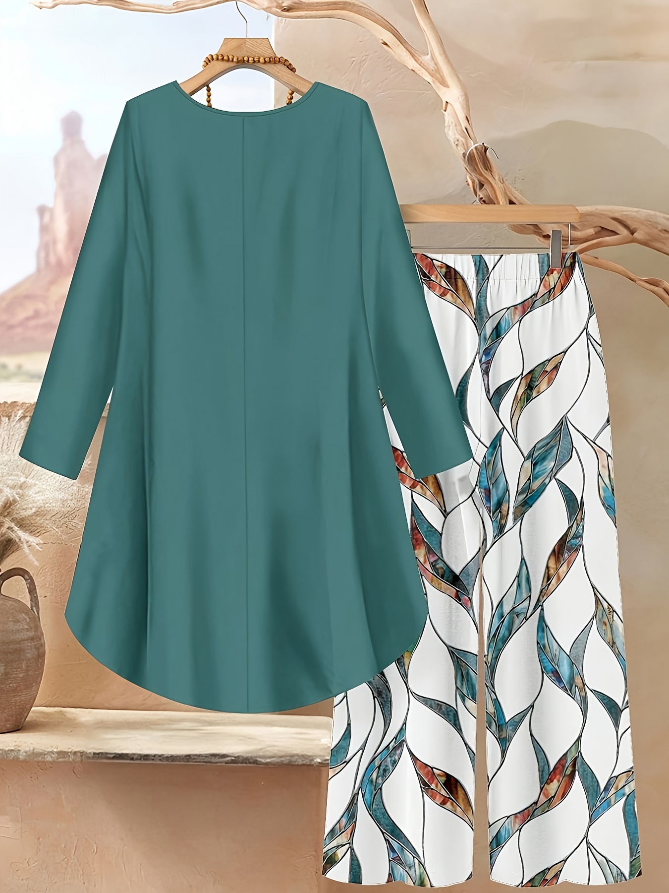 Women'S 2pcs Set - Elegant Leaf Print Long-Sleeve Top & Pants, Loose Fit, All-Season Comfort, Casual Style, Perfect for Fall & Winter, Casual Wear|Elegant Casualwear|Comfortable Fit, Ladies Pants