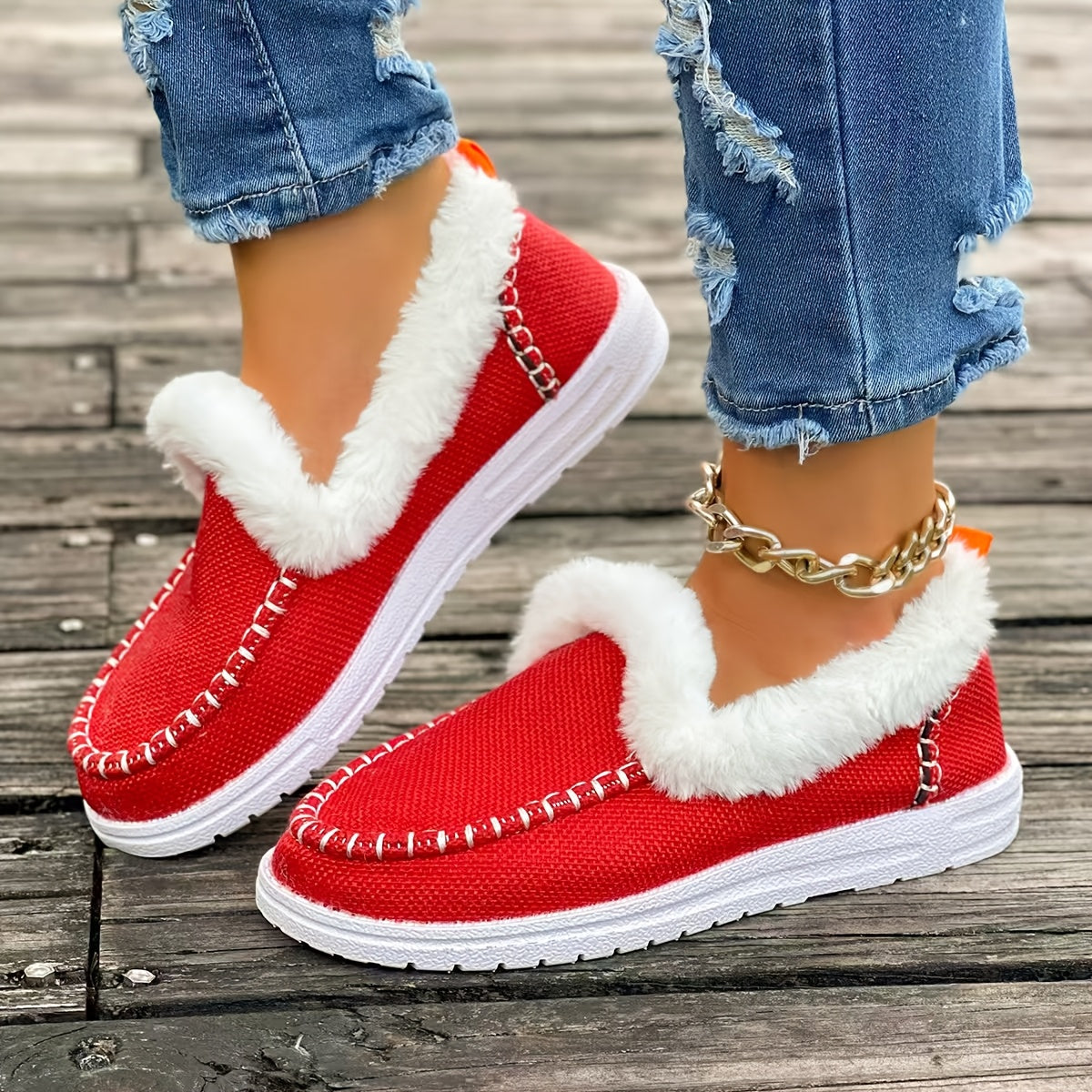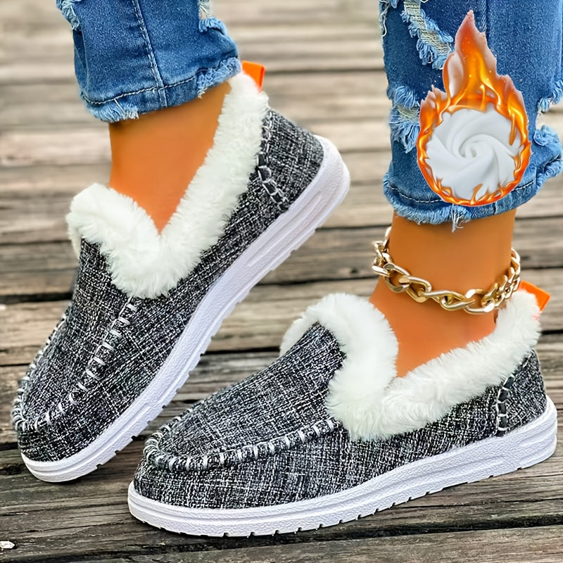 Women's Winter Slip-On Loafers with Faux Fir Denim Blue EVA Sole, Indoor/Outdoor Winter Footwear