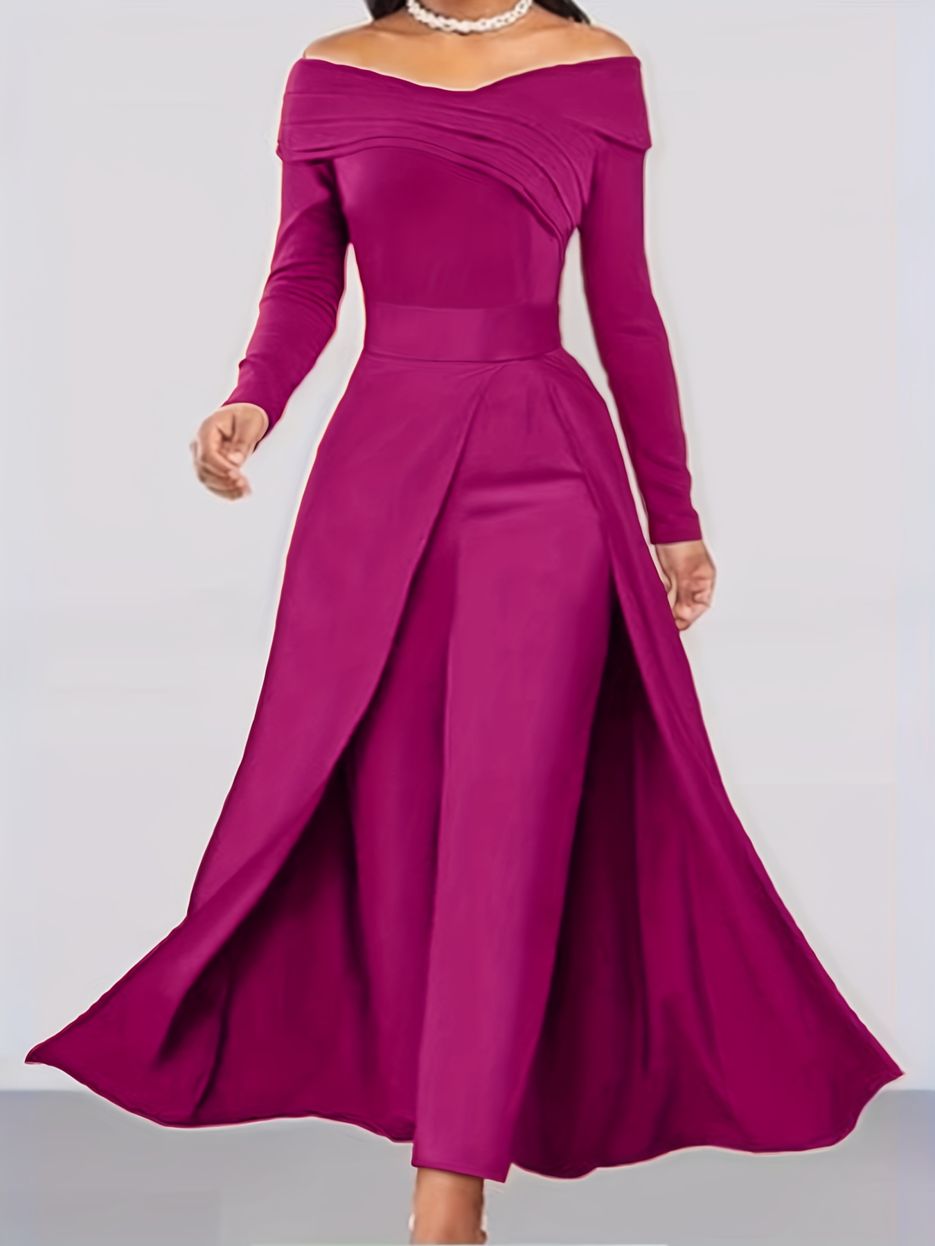 Women's Elegant Off-Shoulder/Boat Neck Two-Piece Set - Solid Color Beige/Black/Navy Blue Tailored Pantsuit, Structured Blazer & Matching Trousers, Machine Washable Autumn to Semi-Formal Attire (No Dry Clean)