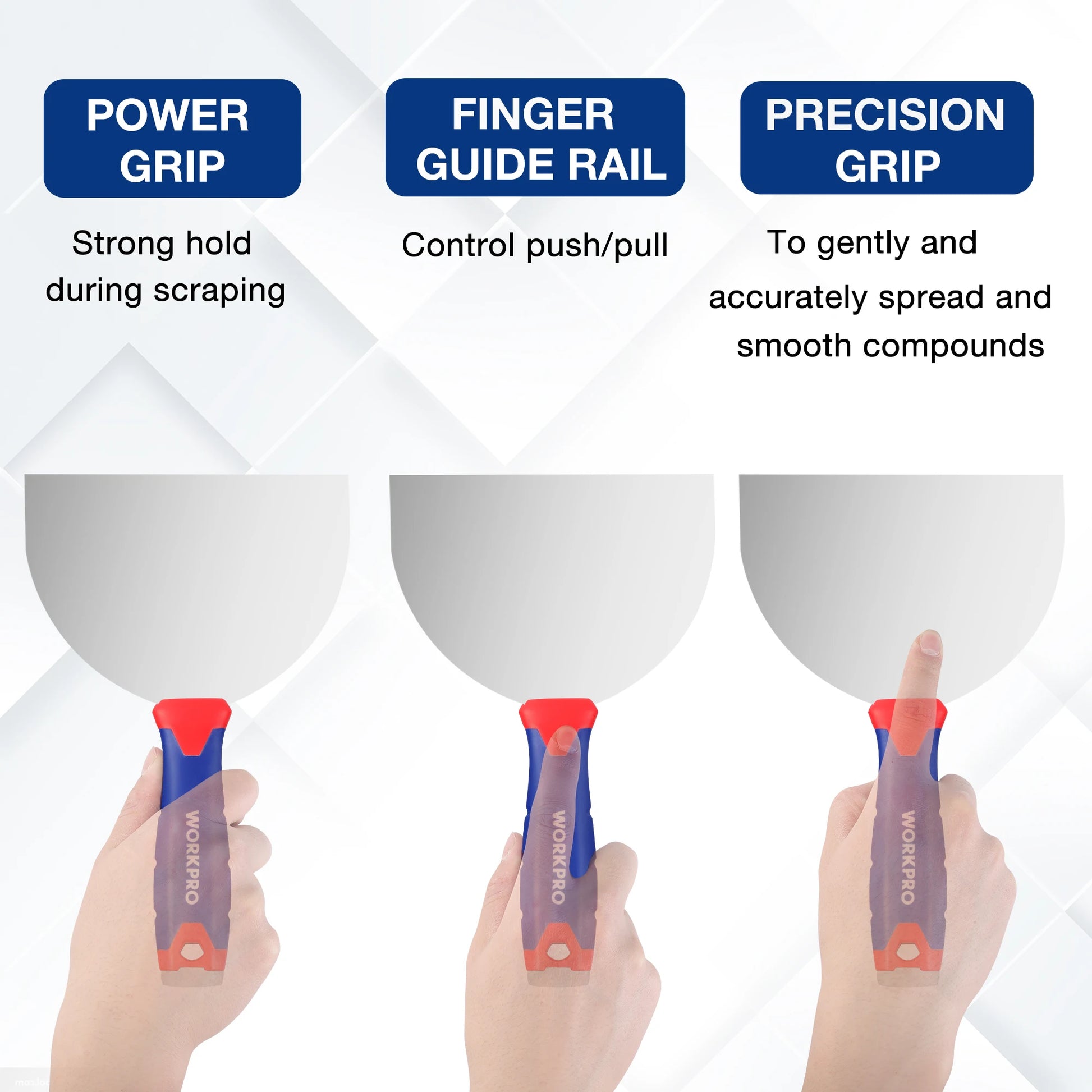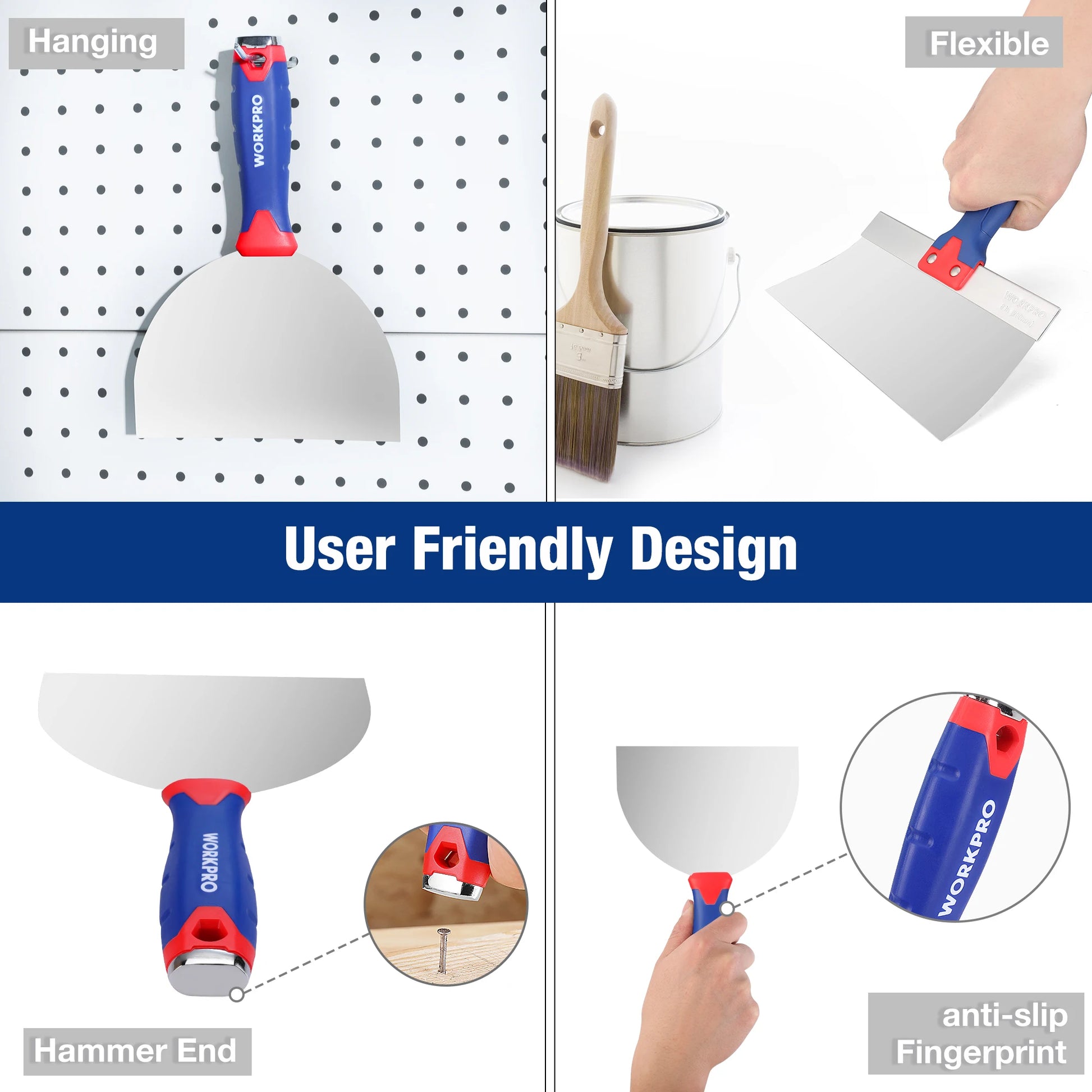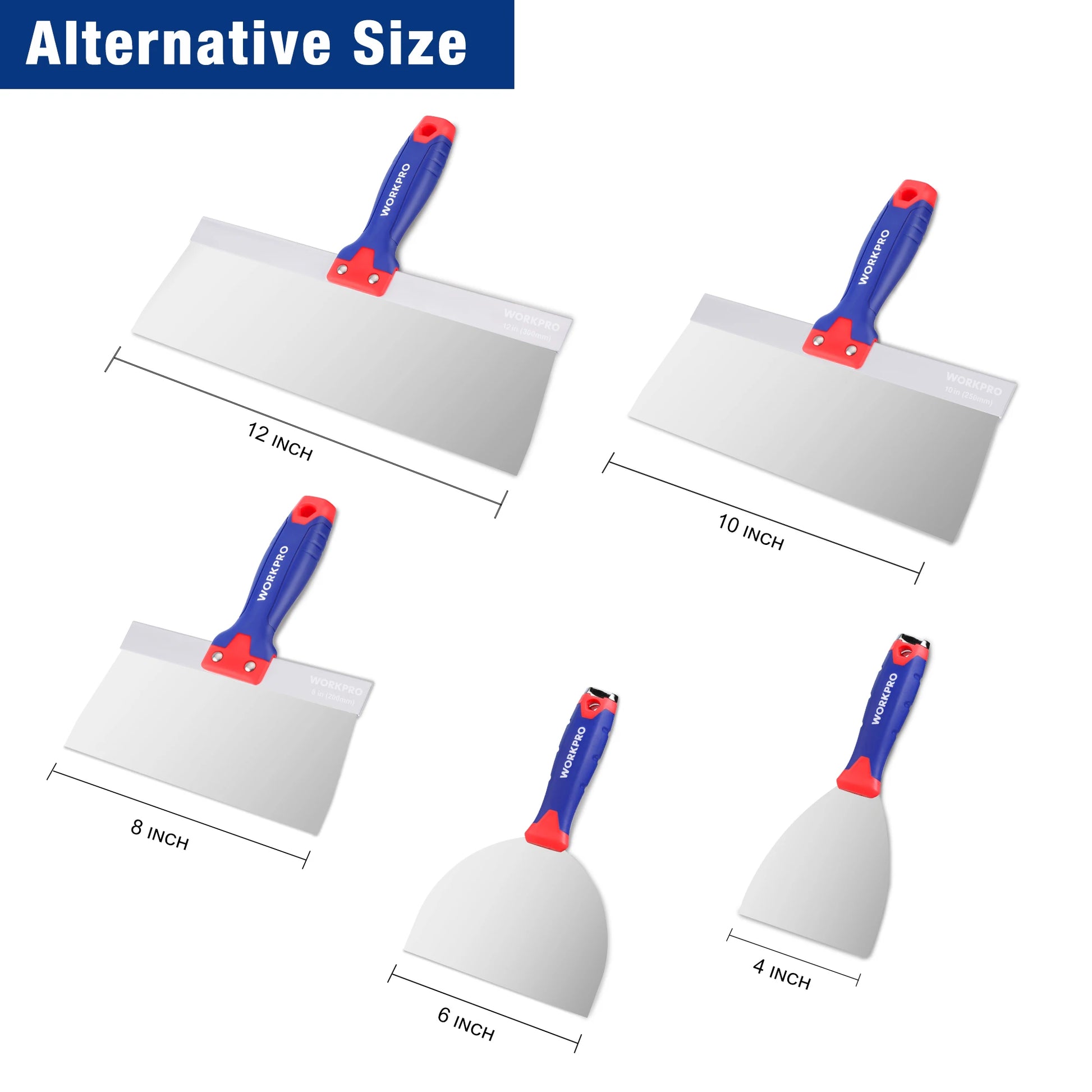 WORKPRO Drywall Knife Set Stainless Steel Taping Knife Putty Knife with 4", 6'', 8'', 10'', 12'' Blades and Alloy Metal Hammer